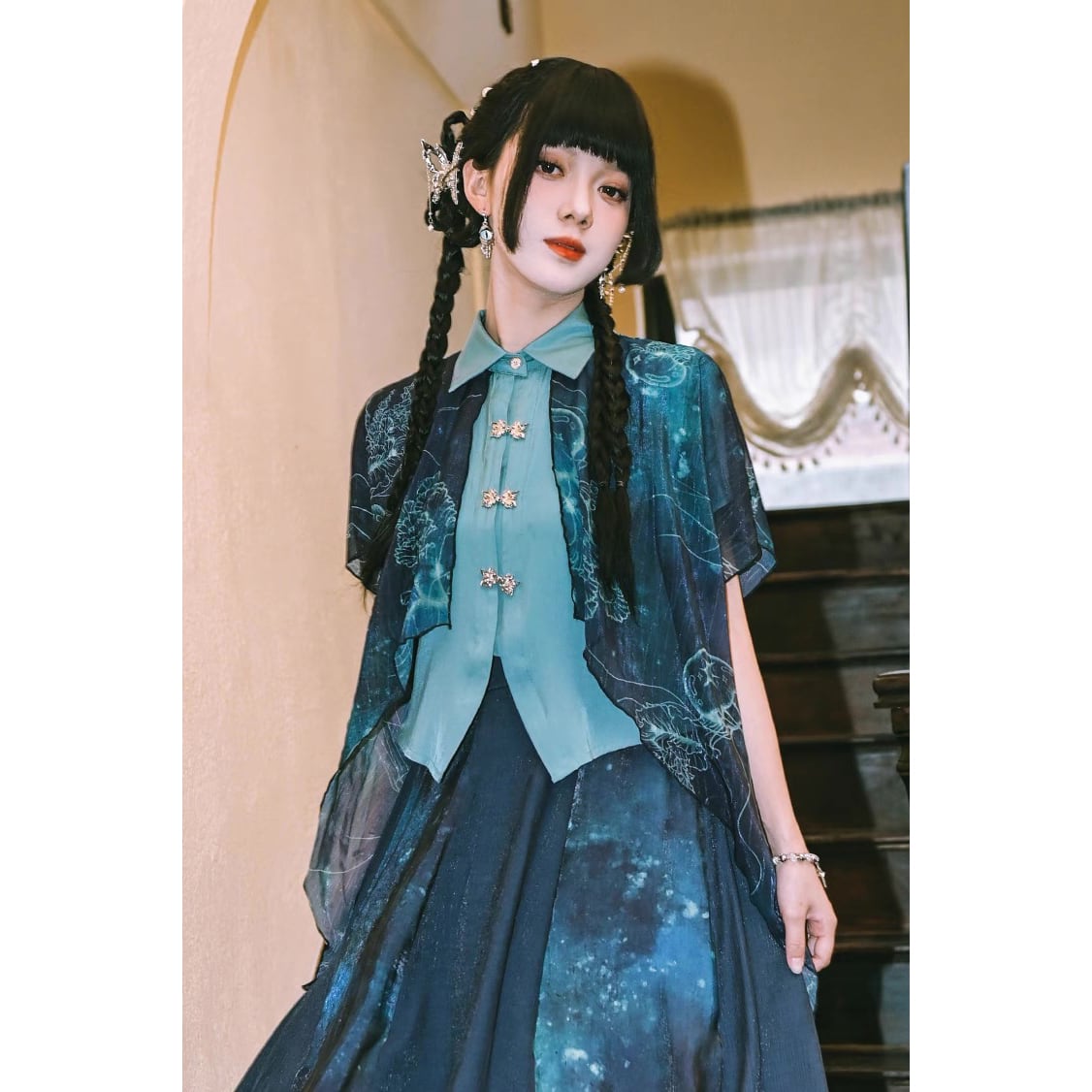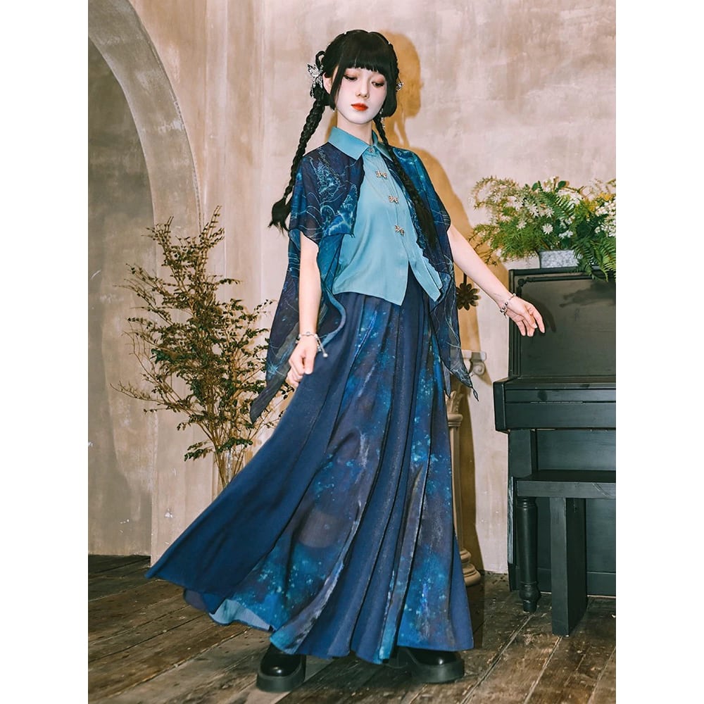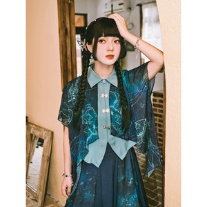【之x古怪舎】★シャツ・青界★ブルー チャイナ風 プリント 中国ファッション シフォン 両層デザイン