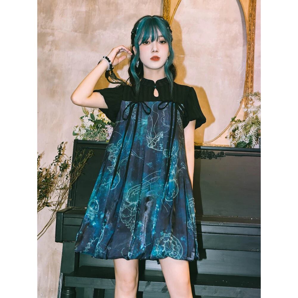 【之x古怪舎】★ワンピース・青界★ブルー チャイナ風 プリント 中国ファッション