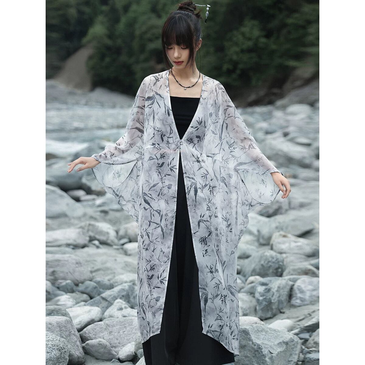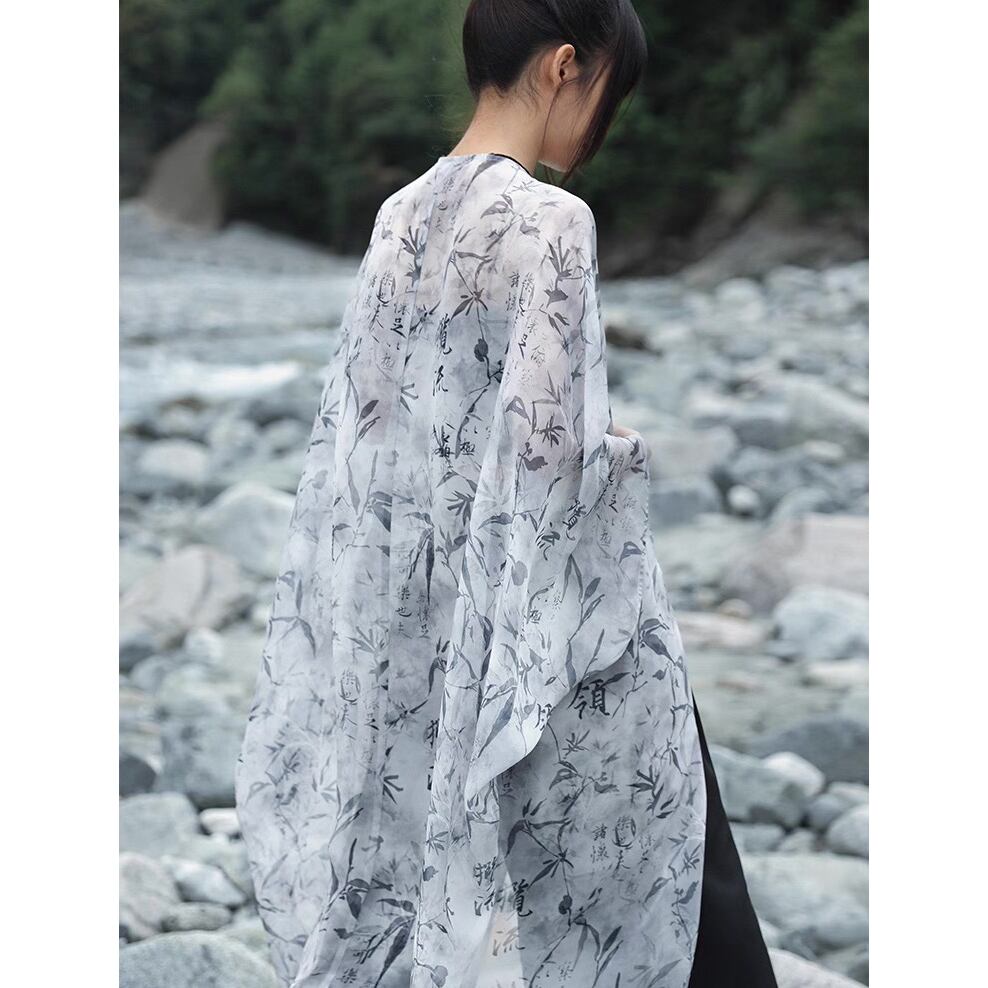 【之x大青龍肆】★ロングシャツ★ホワイト チャイナ 中国ファッション シフォン 竹柄