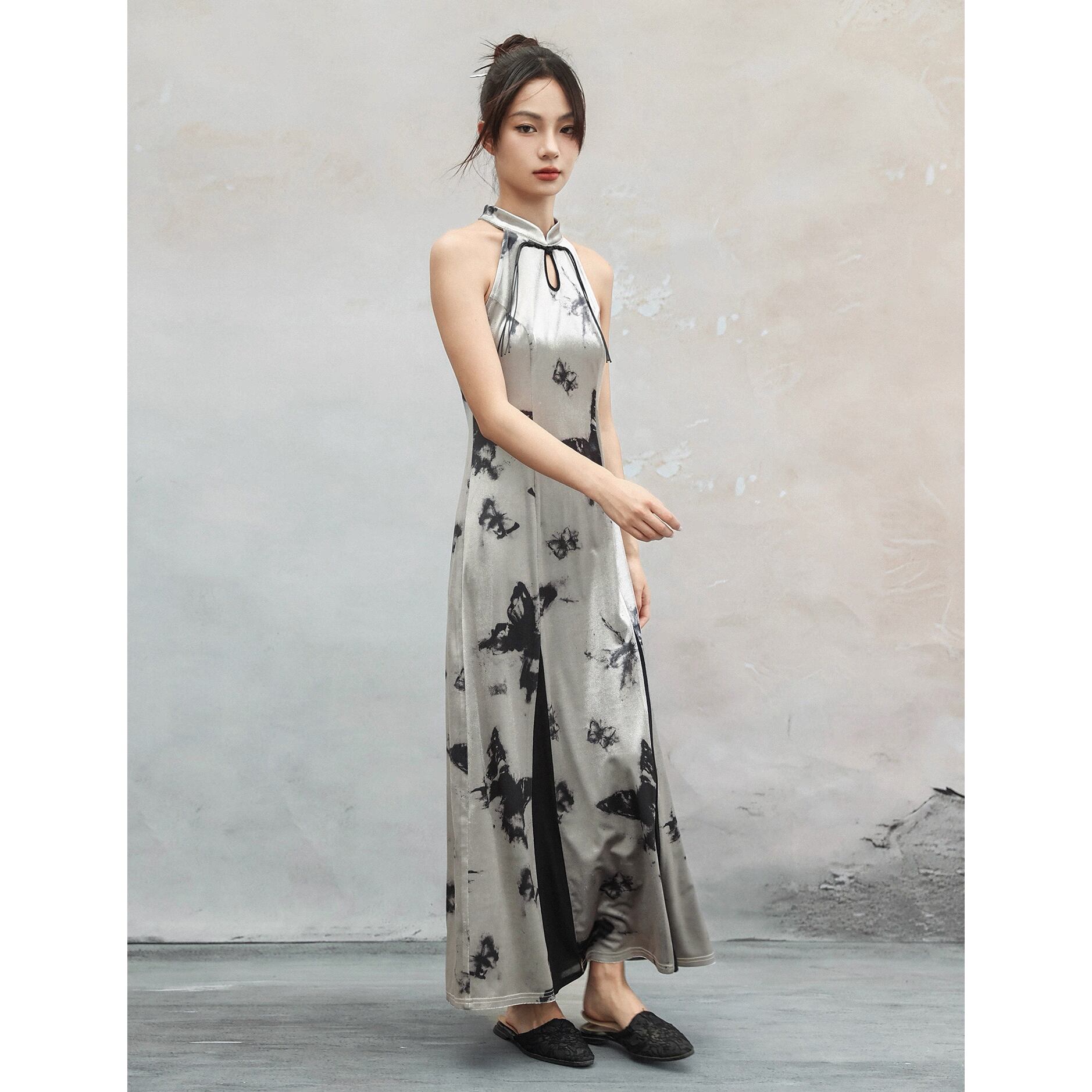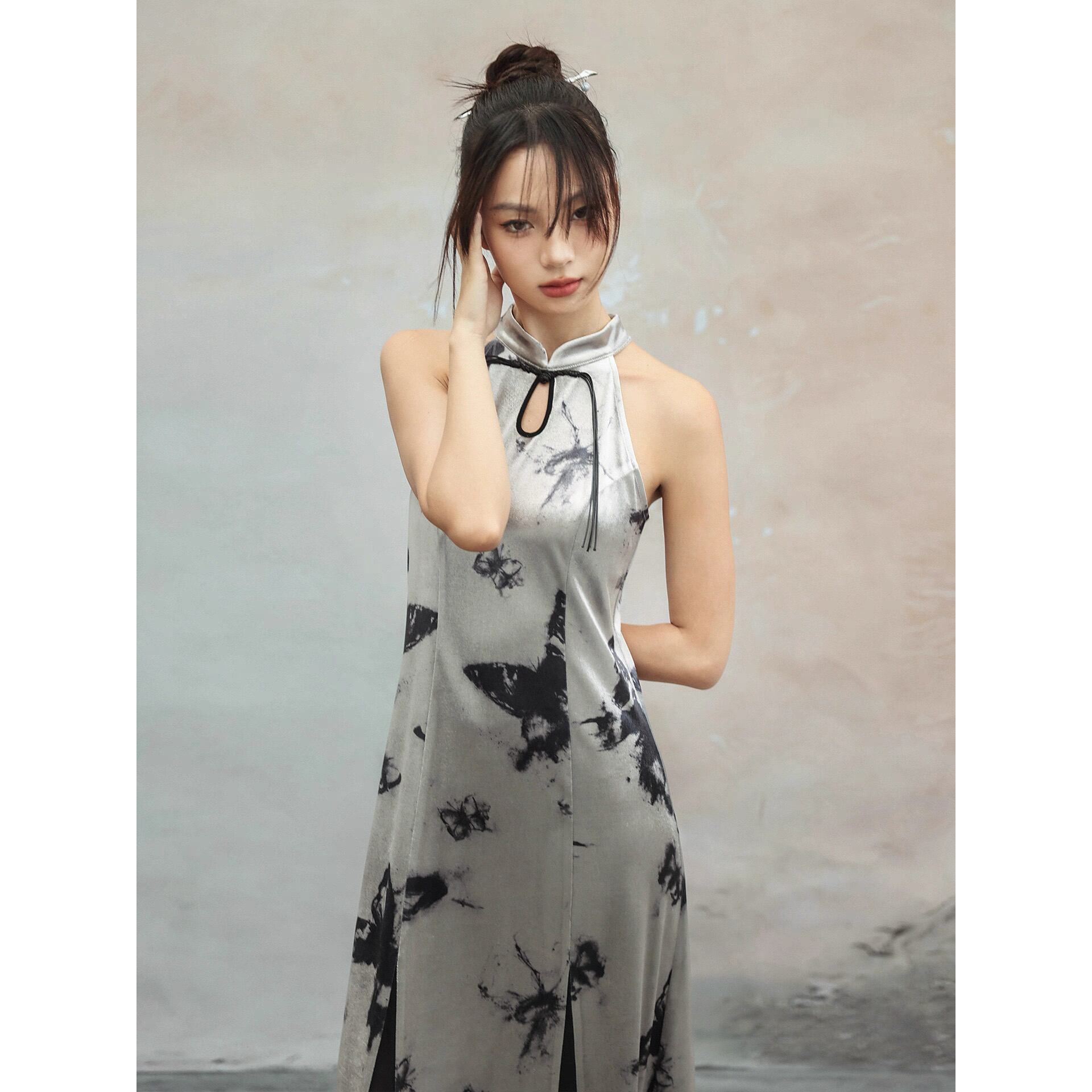 【之x大青龍肆】★ワンピース★グレー 中国ファッション ノースリーブ ベロア