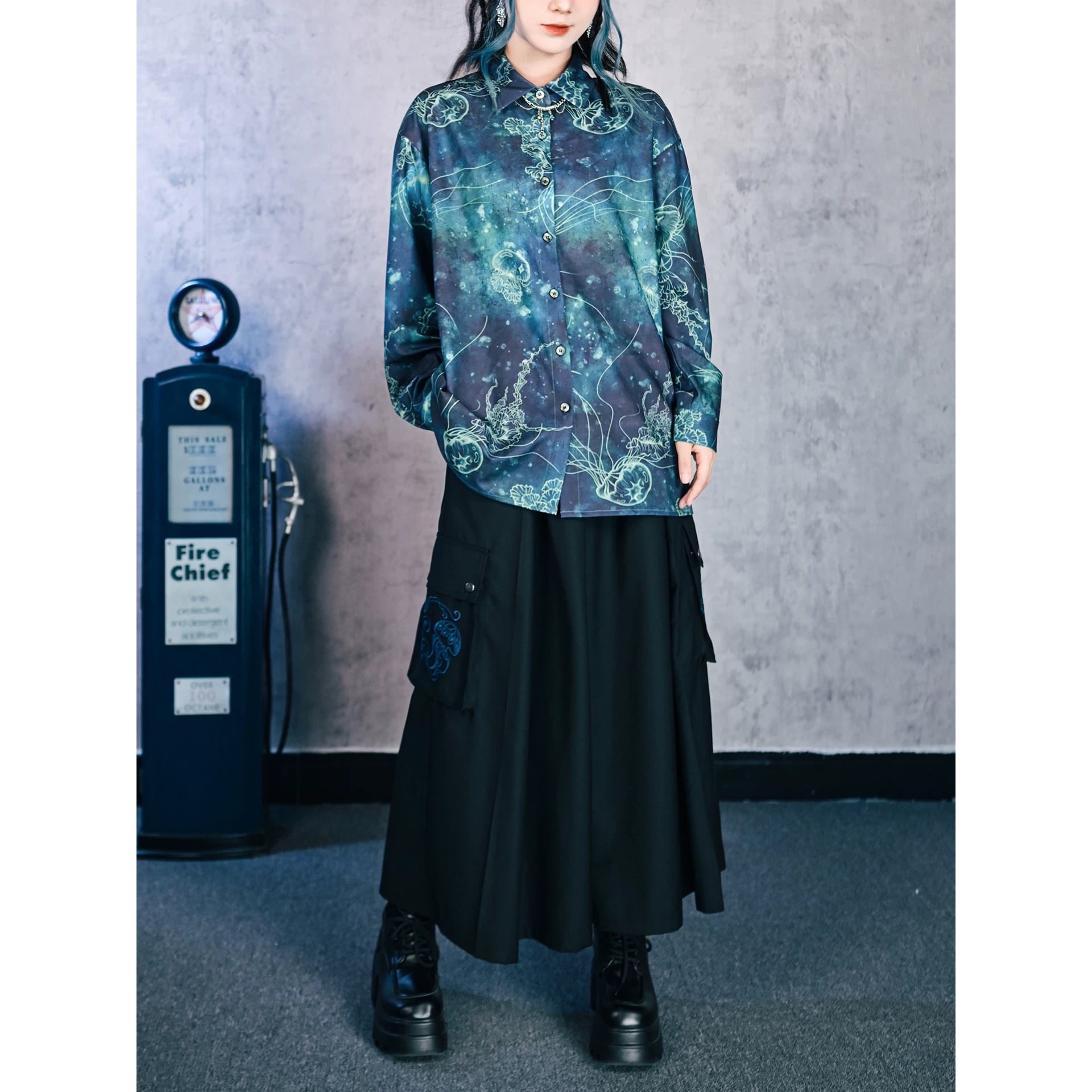 【之x古怪舎】★ワイドパンツ・青界★ブラック チャイナ風 刺繍 デザイン 中国ファッション