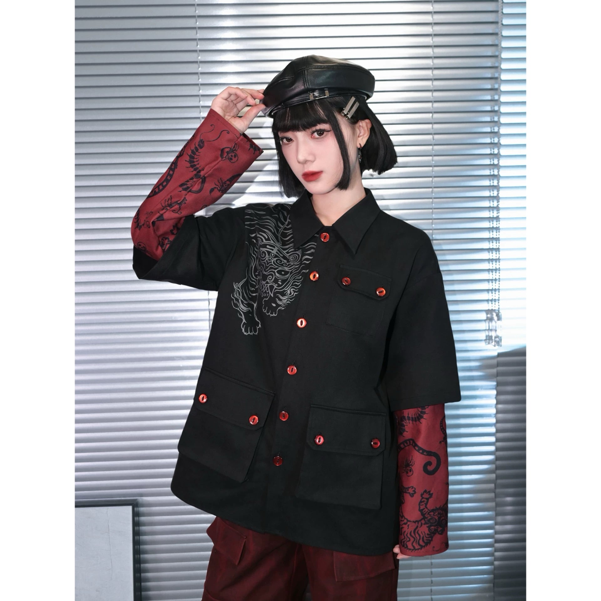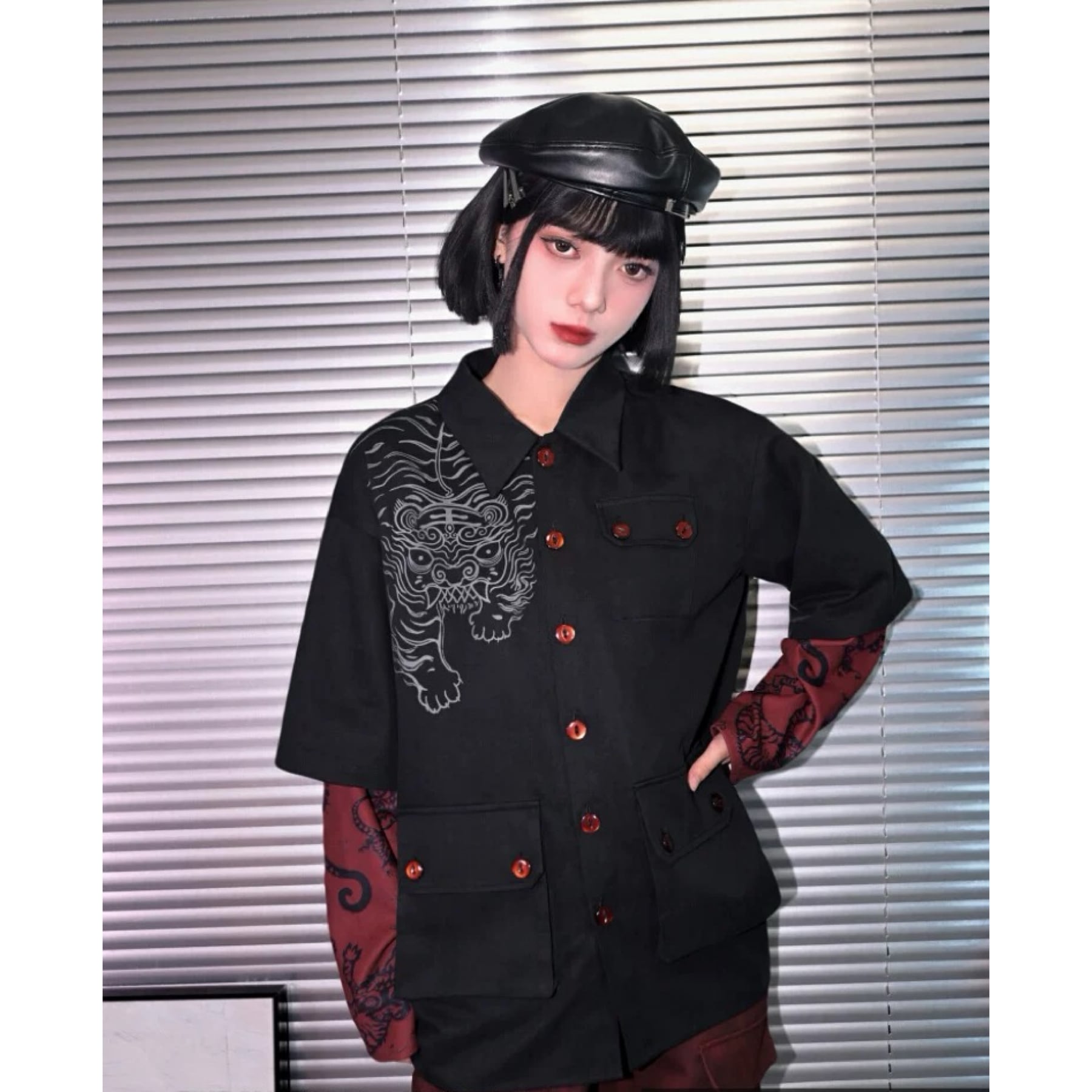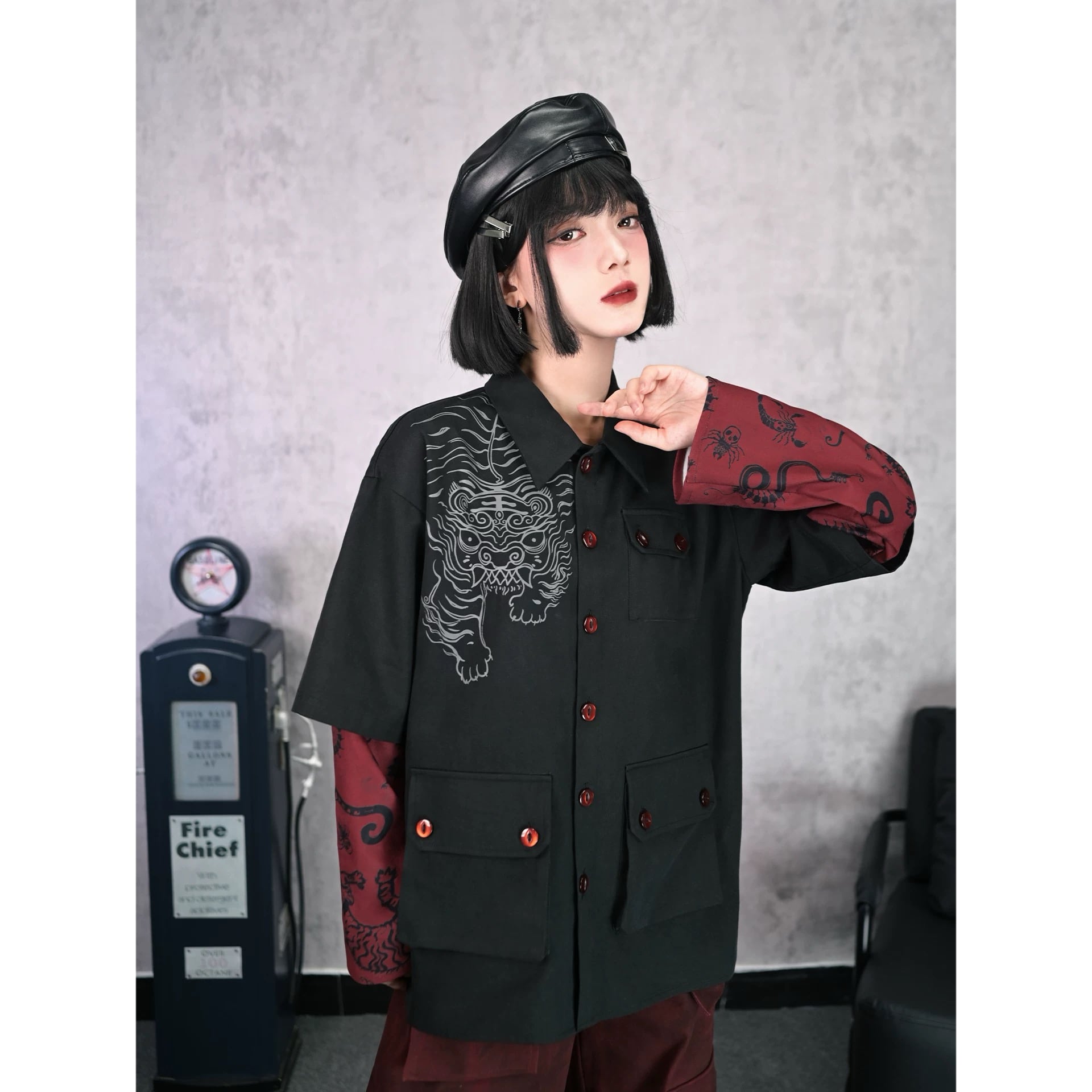 【之x古怪舎】★シャツ・五毒★ブラック チャイナ風 フェイクレイヤード 中国ファッション プリント