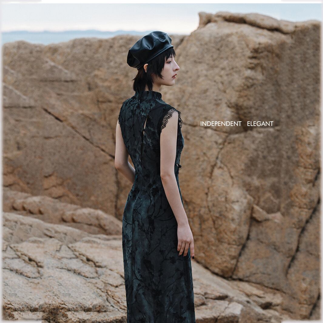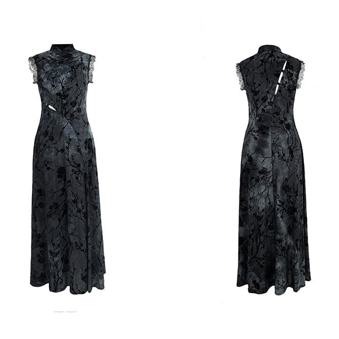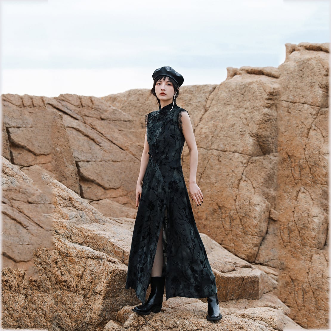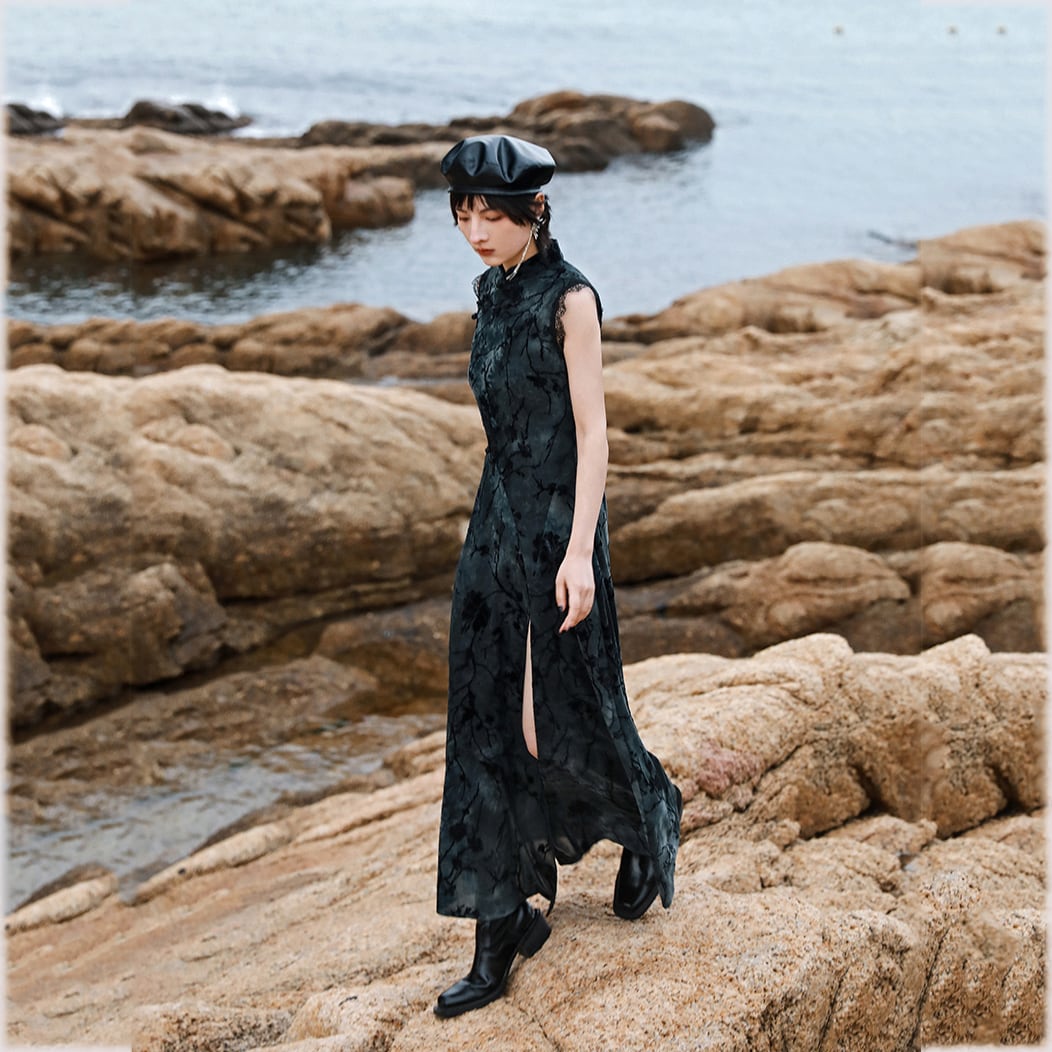 深い藍色に漆黒の花模様が描かれたベルベットチャイナワンピース。程よいチャイナ風テイストが乙女心をくすぐります。細身のスタイルとなっています。レースとのノースリーブの綴り合せは美しき"黒"を纏って妖艶な中華ガールに。