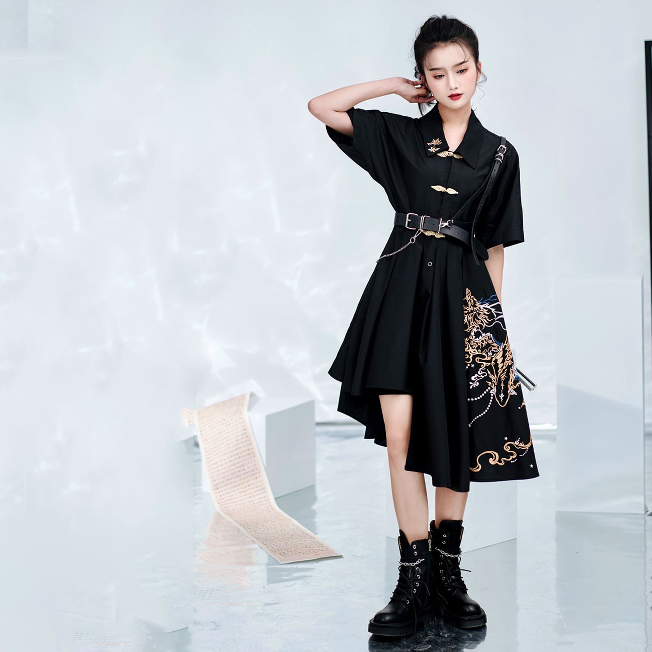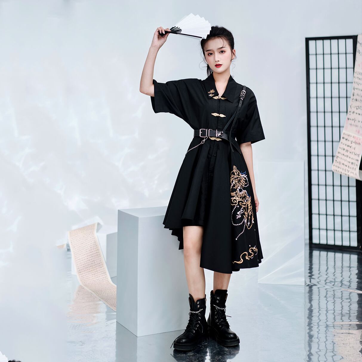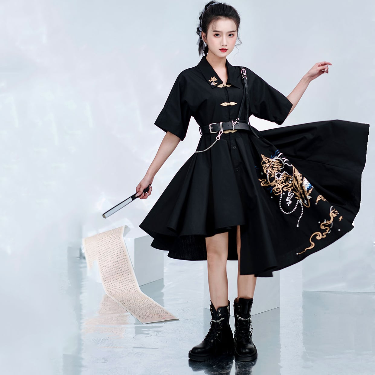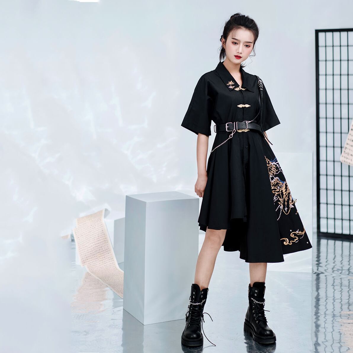 【之x卿堂】★ワンピース・竜門★ブラック 刺繍 棉 麻 竜門に躍る ホック アシンメトリー kore