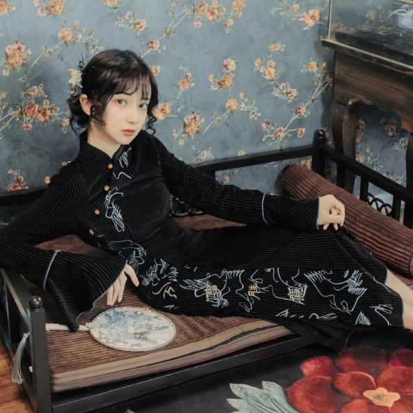✪人気ドレス✪【之】★チャイナドレス★ブラック デザイン 刺繍 スピーカースリーブ ホック 棉 kore