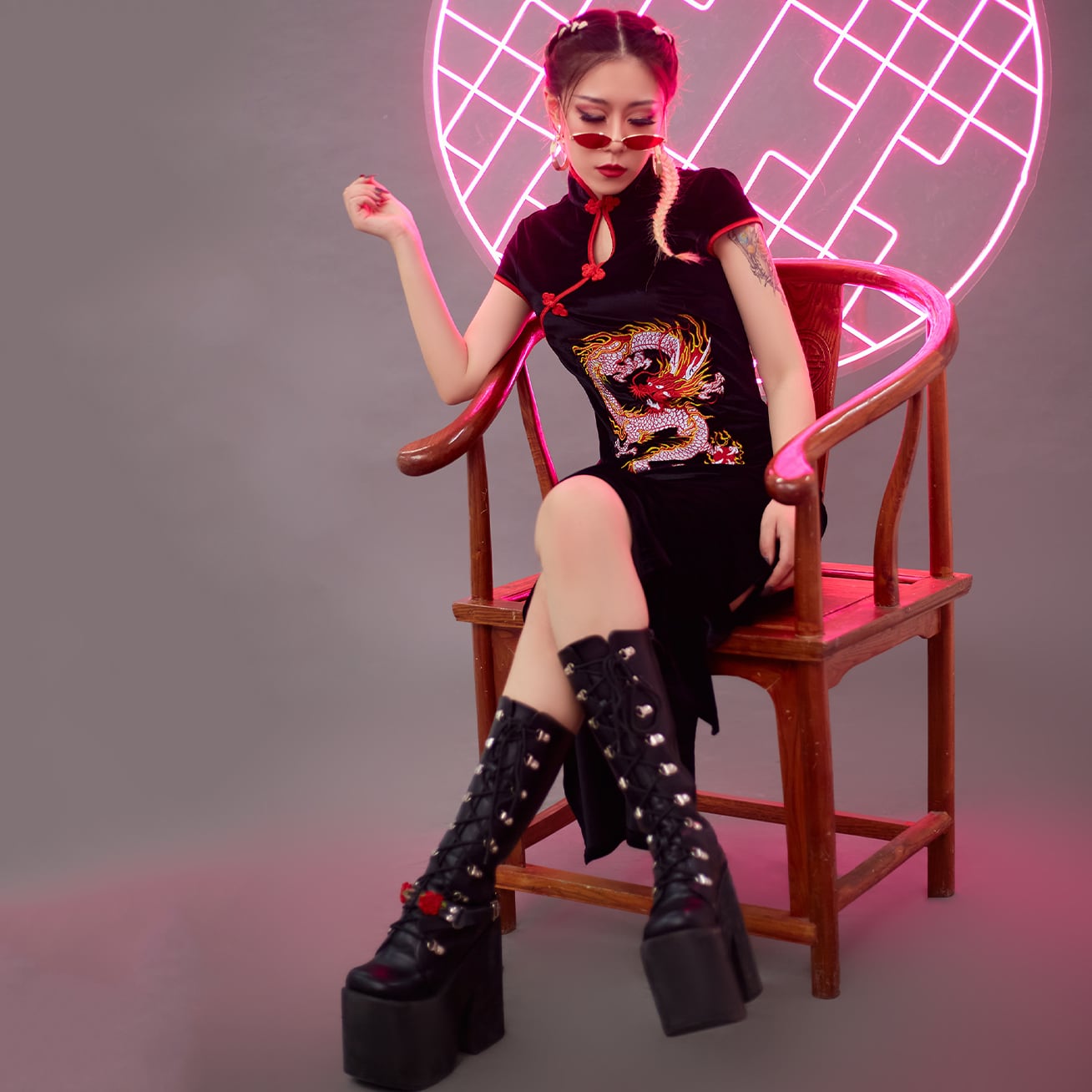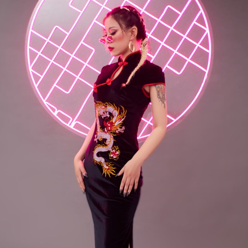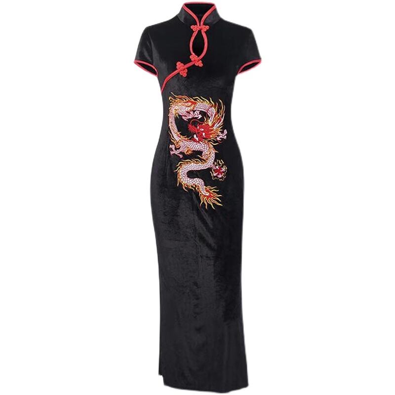 【之】★チャイナ風ワンピース★ブラック デザイン セクシー 刺繍 龍柄 ホック 入学式 卒業式 kore
