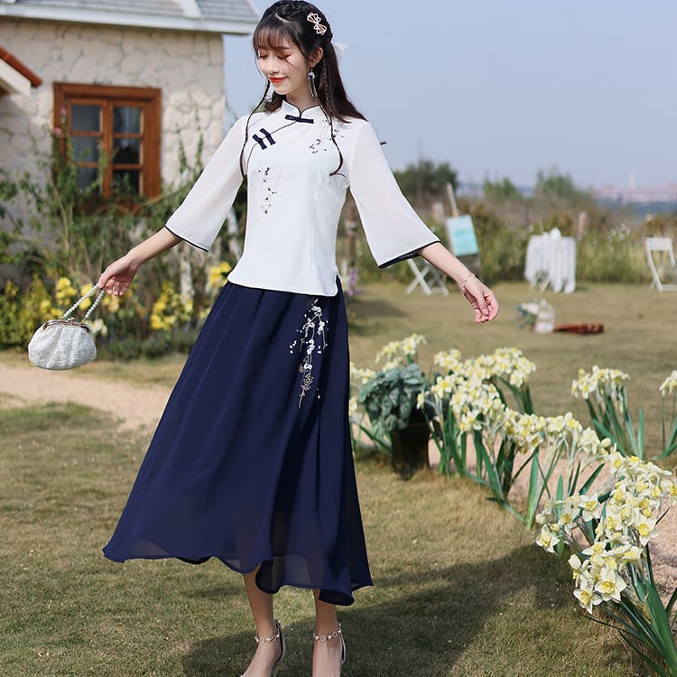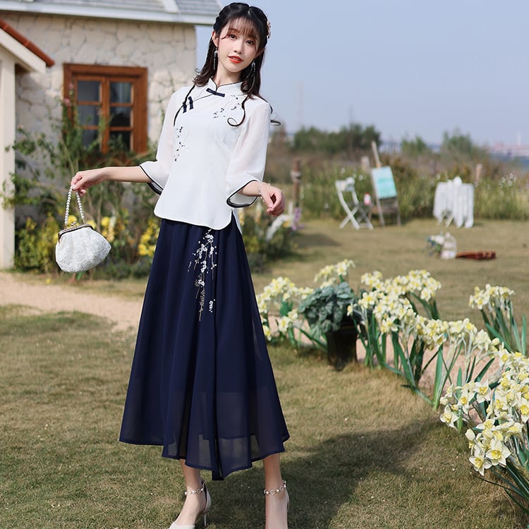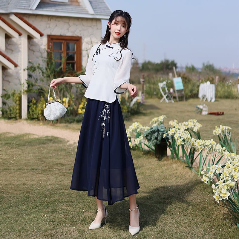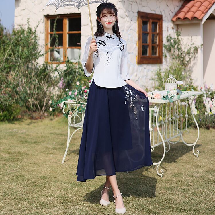 【之】★ロングスカート★ネイビー チャイナ風 刺繍 エレガント シンプル kore