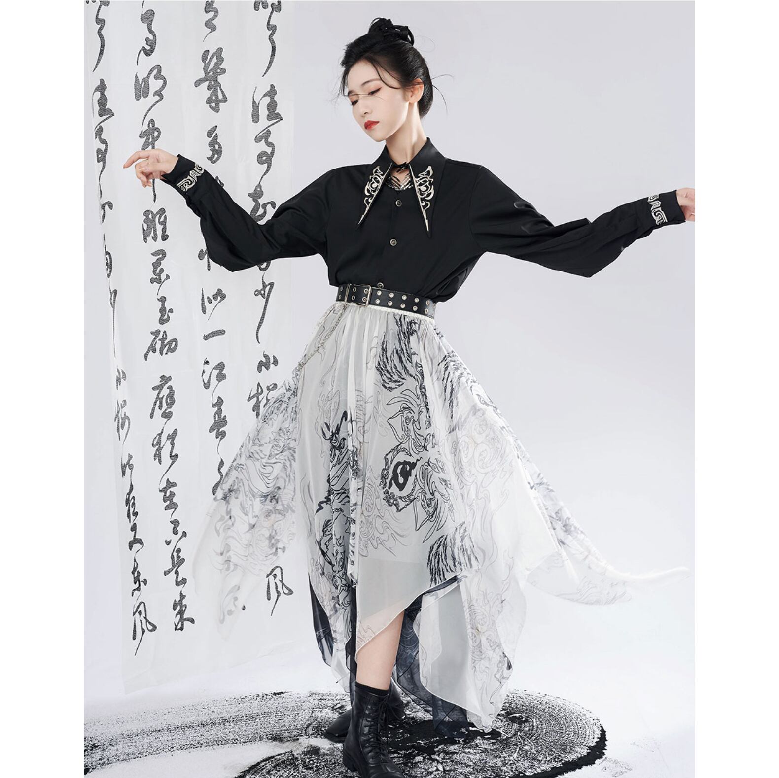 【之x卿堂】★チャイナ風スカート★ホワイト ブラック プリント シフォン 漢字 古詩 kore | 之