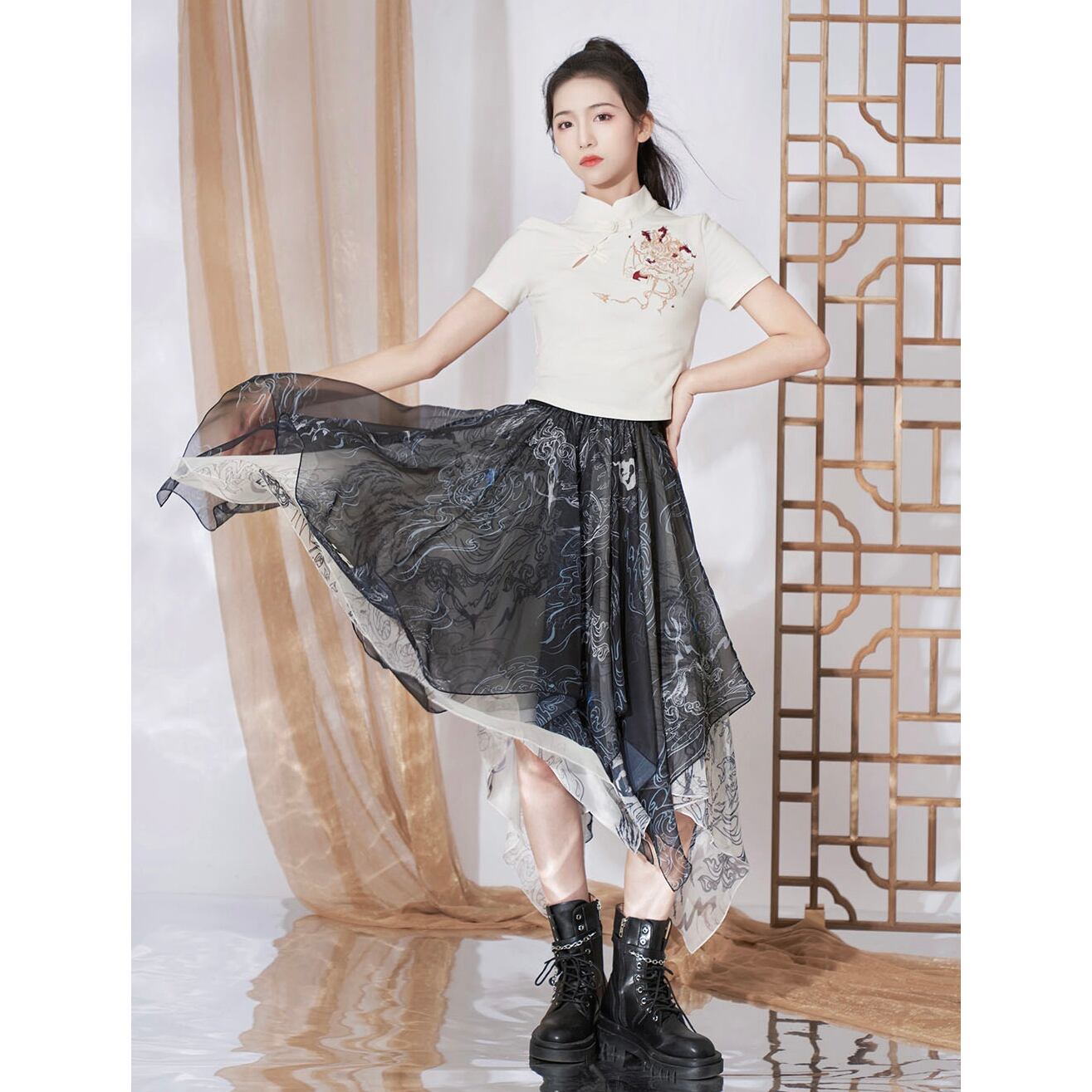 【之x卿堂】★チャイナ風スカート★ホワイト ブラック プリント シフォン 漢字 古詩 kore