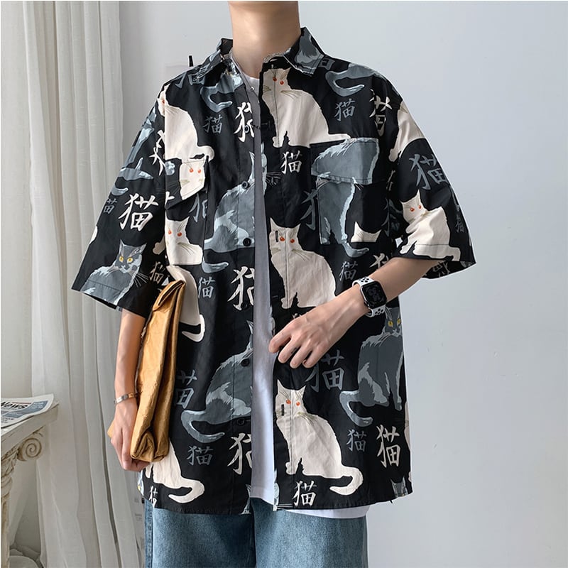 ✪人気商品✪【之】★激安シャツ★グリーン ブラック 猫 プリント 半袖 メンズ kore | 之
