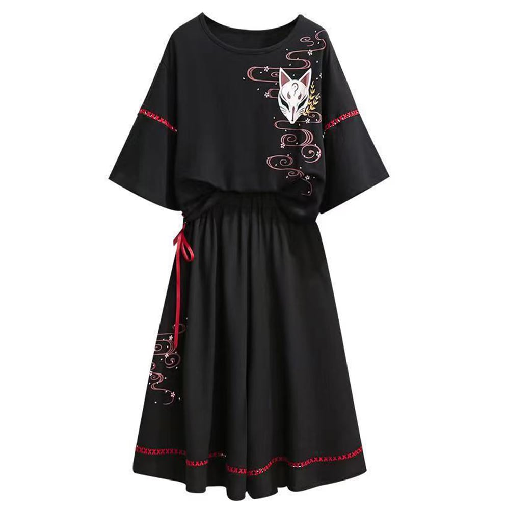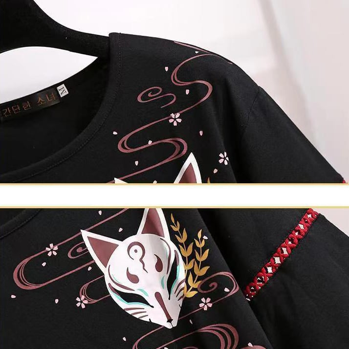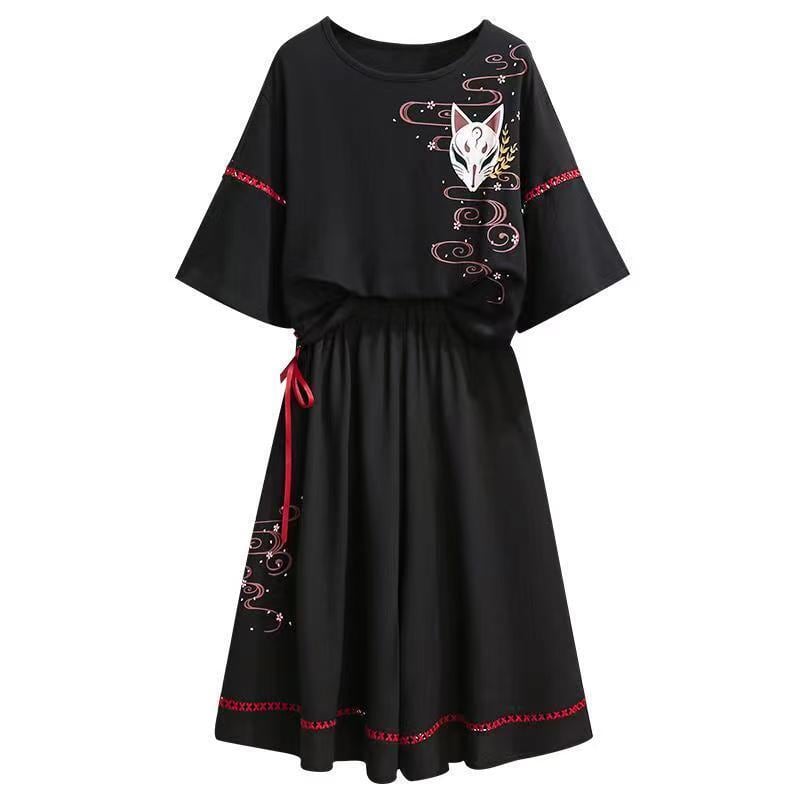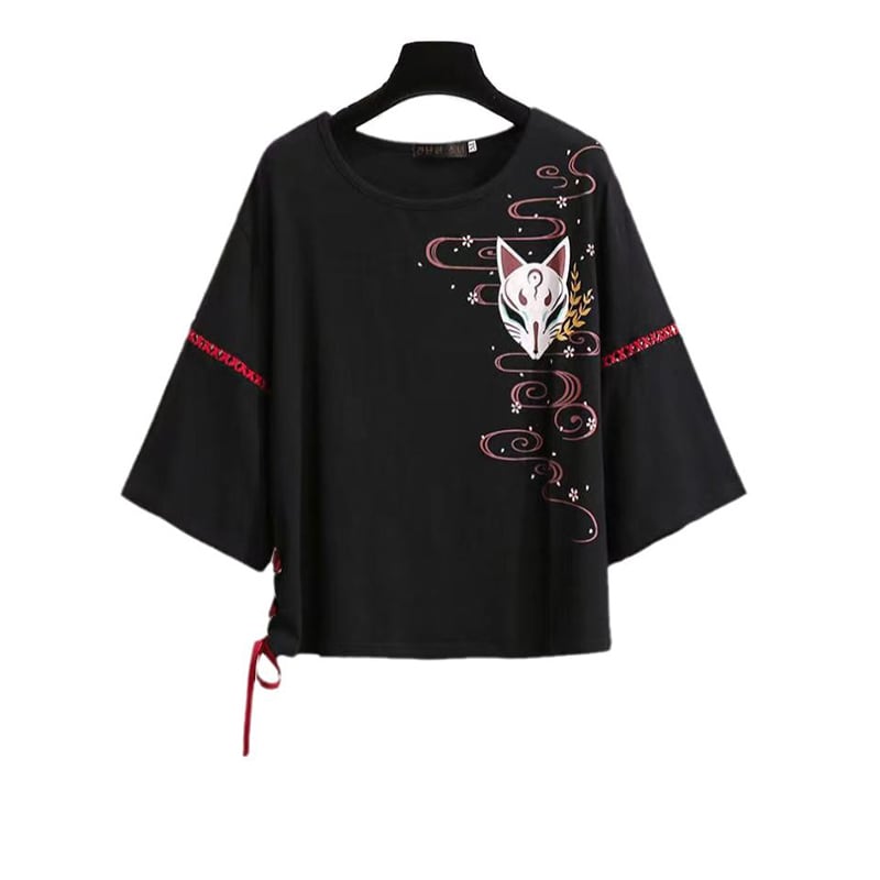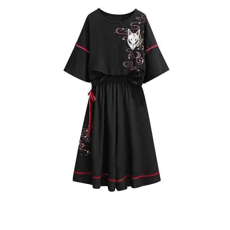 【之】★セットアップ★ブラック チャイナ風 刺繍 デザイン 猫柄 カジュアル 五分丈 kore