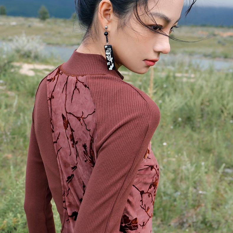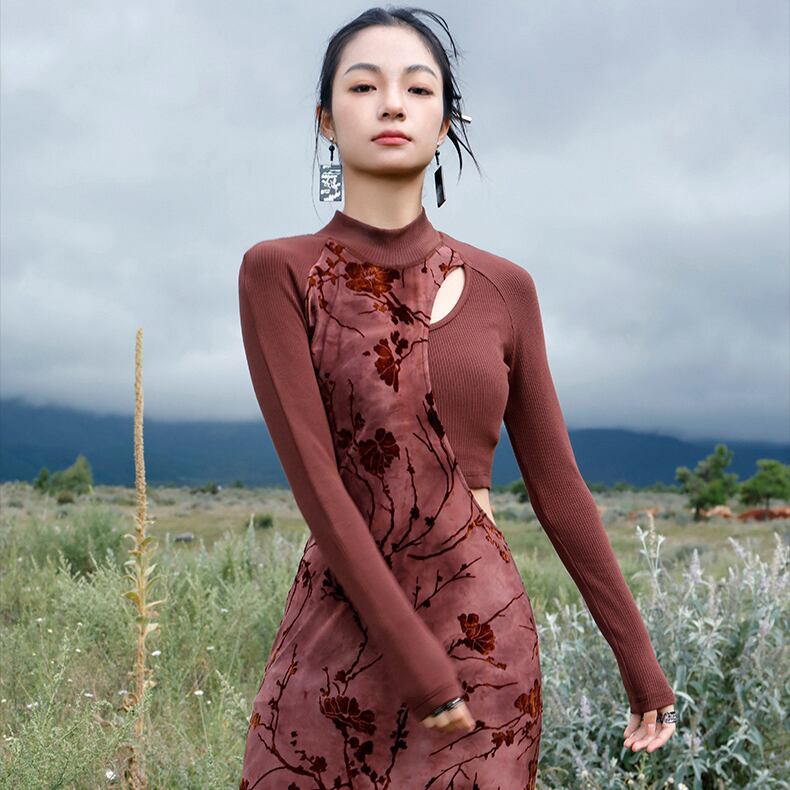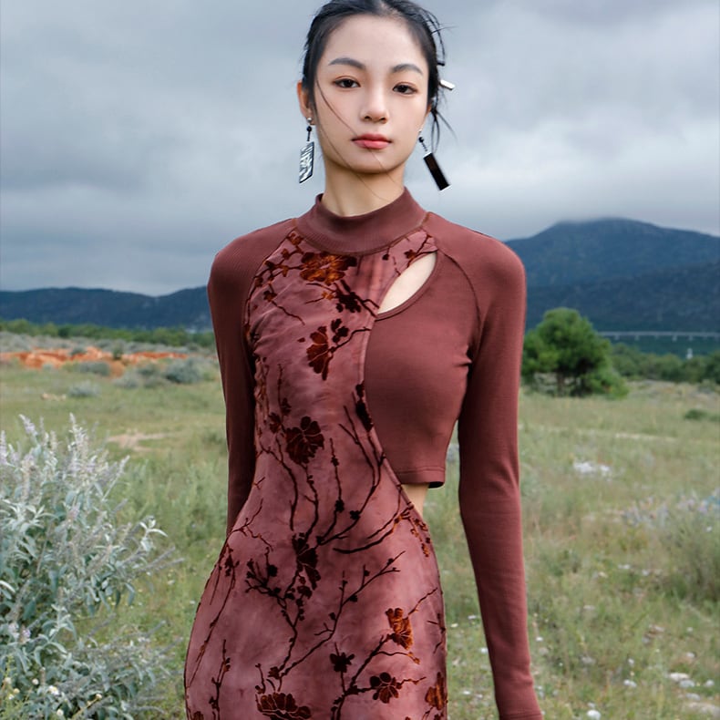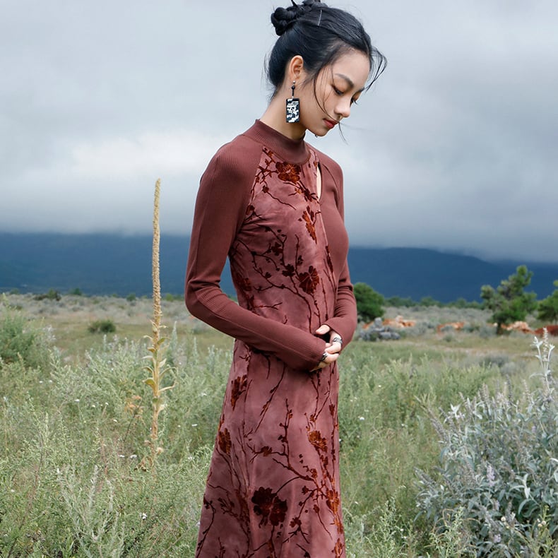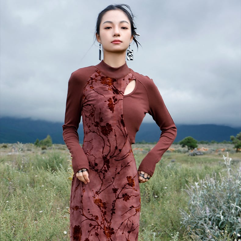 ◇微火持者◇【之x大青龍肆】★チャイナ風ワンピース★レンガ色 デザイン ジャンパー フェイクレイヤード風 入学式 卒業式 kore