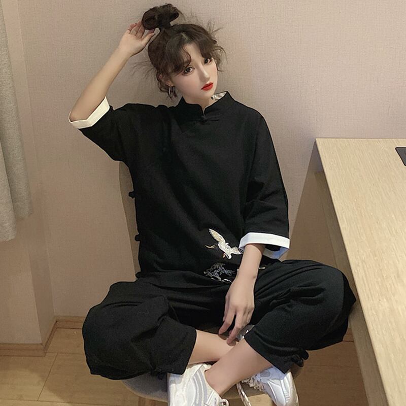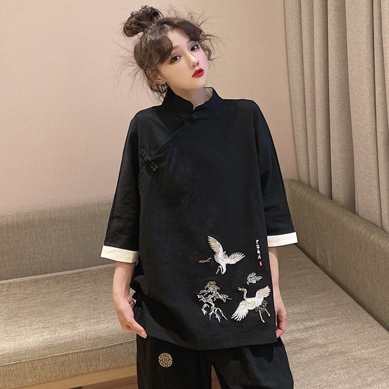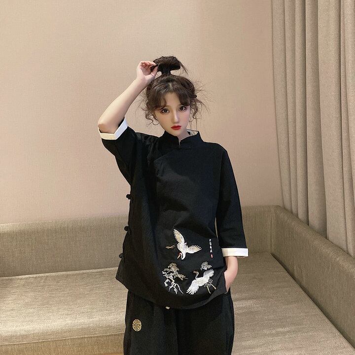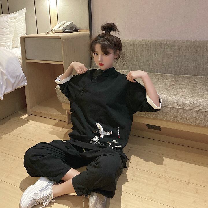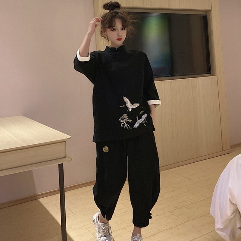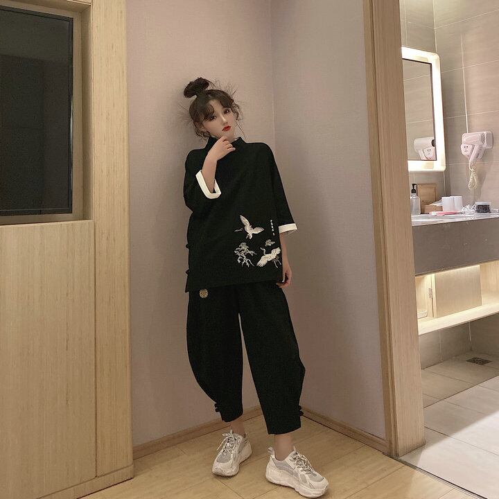 【之】★セットアップ(トップス+ボトムス)★ブラック vintage カジュアル 刺繍 鶴 kore