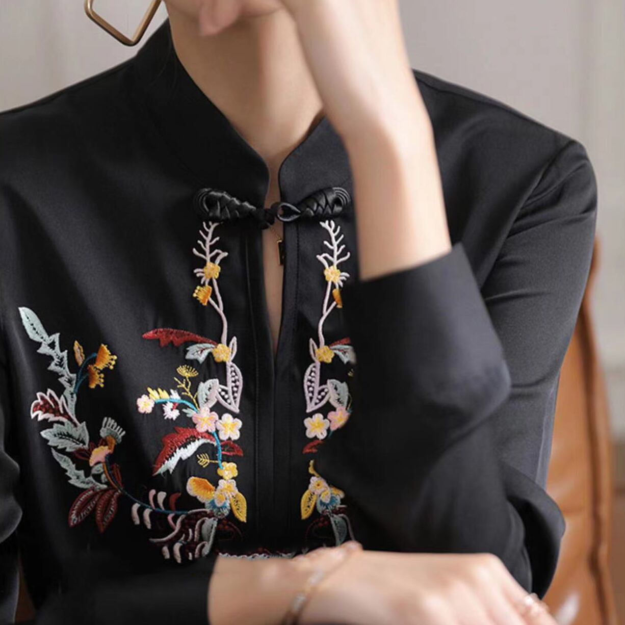 ✪人気上昇✪【之】★チャイナ風シャツ★ブラック ホワイト 中華服 レディース ホック 長袖 刺繍 kore