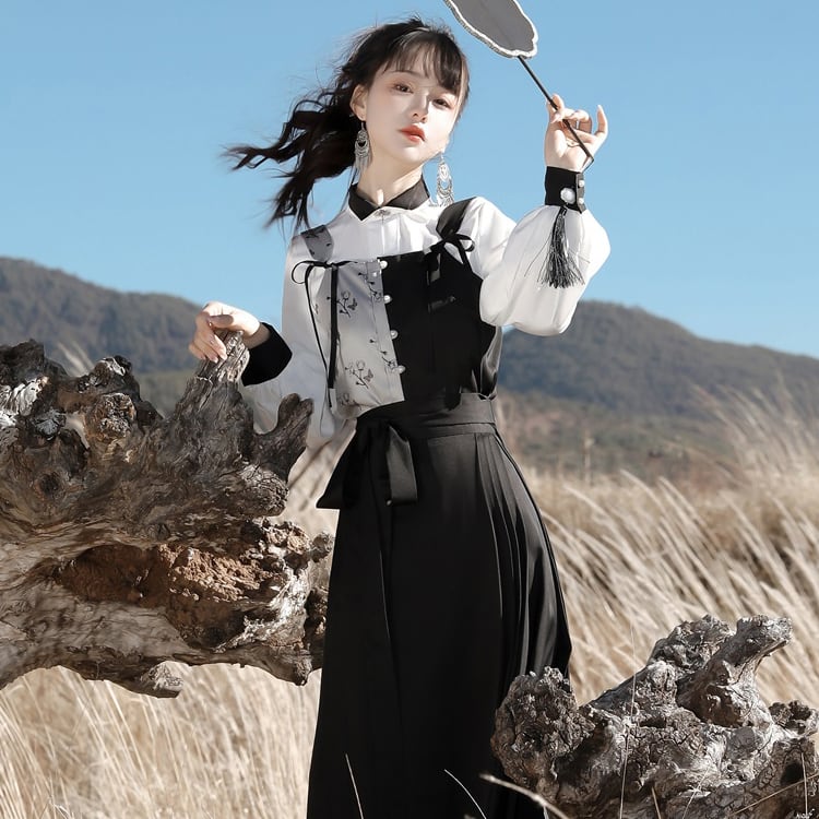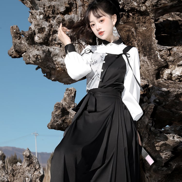 【之】★チャイナ風ベスト+シャツ+巻きスカート★ブラック チャイナドレス 中華服 レディース kore