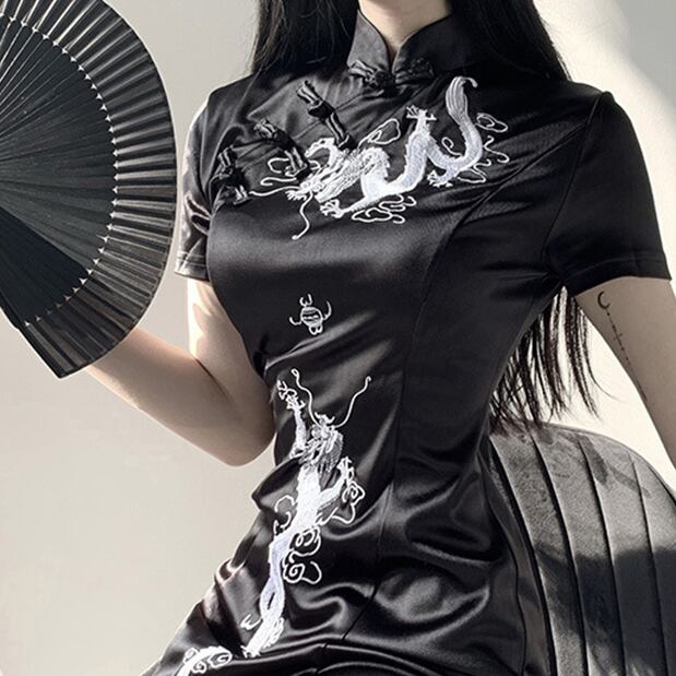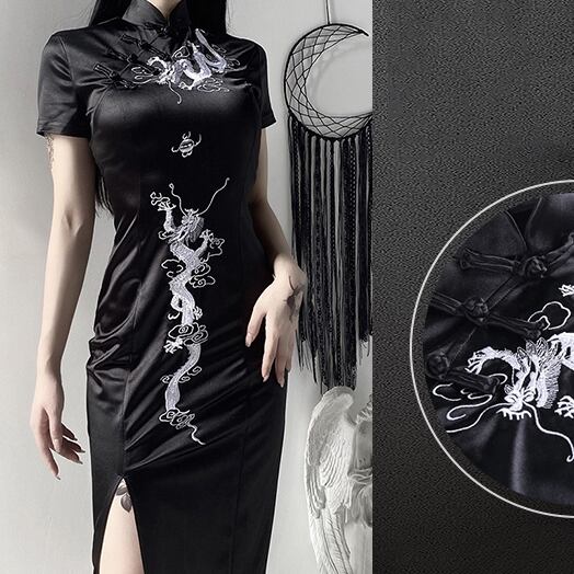 【之】★チャイナ風ワンピース★ブラック 入学式 卒業式 龍柄 暗黒風 結び目ボタン kore