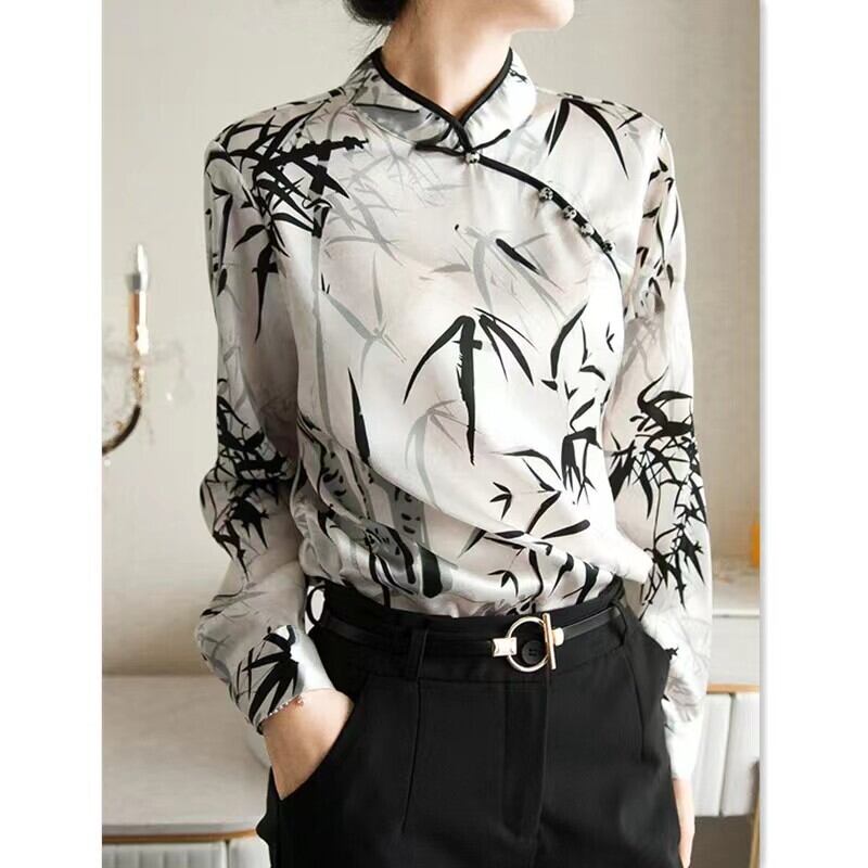 【之】★チャイナ風シャツ★ブラック 中華服 レディース 刺繍 結び目ボタン