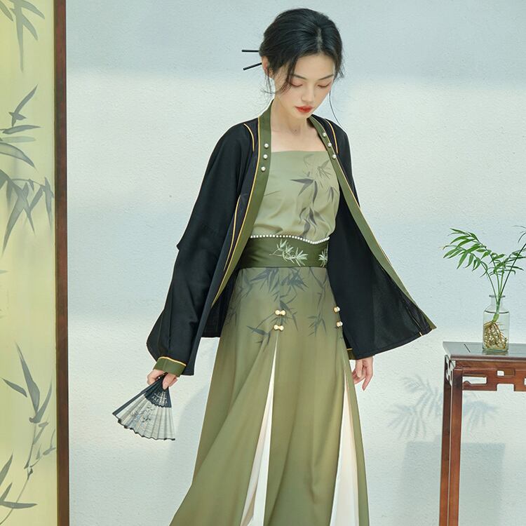 【之】★チャイナ風シャツ+キャミソール★グリーン チャイナドレス 中華服 レディース 刺繍 漢服 真珠 竹 kore