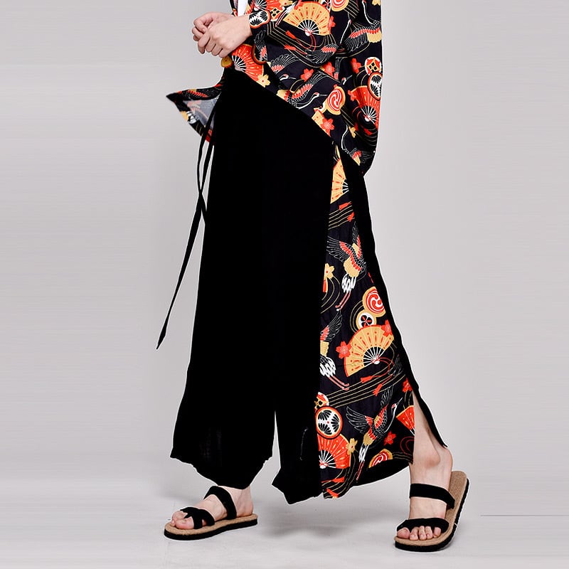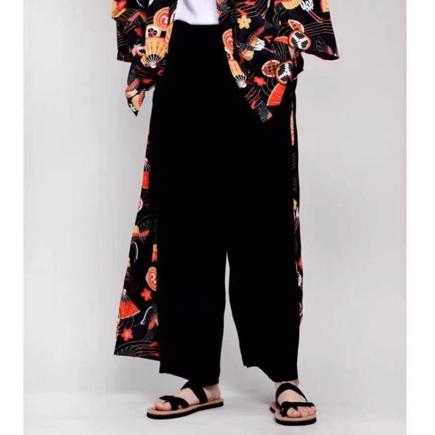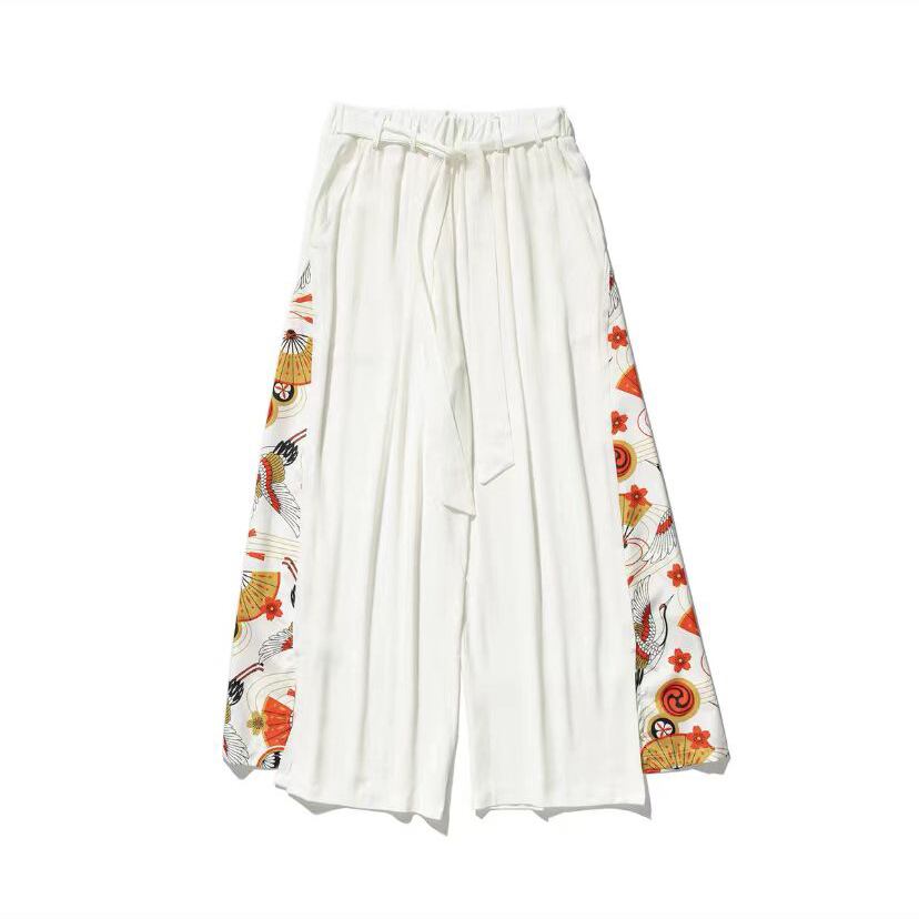 ✪チャイナ風新作✪【之】★メンズ・ズボン★ブラック ホワイト ワイドパンツ 扇子 浮世絵ガウチョパンツ