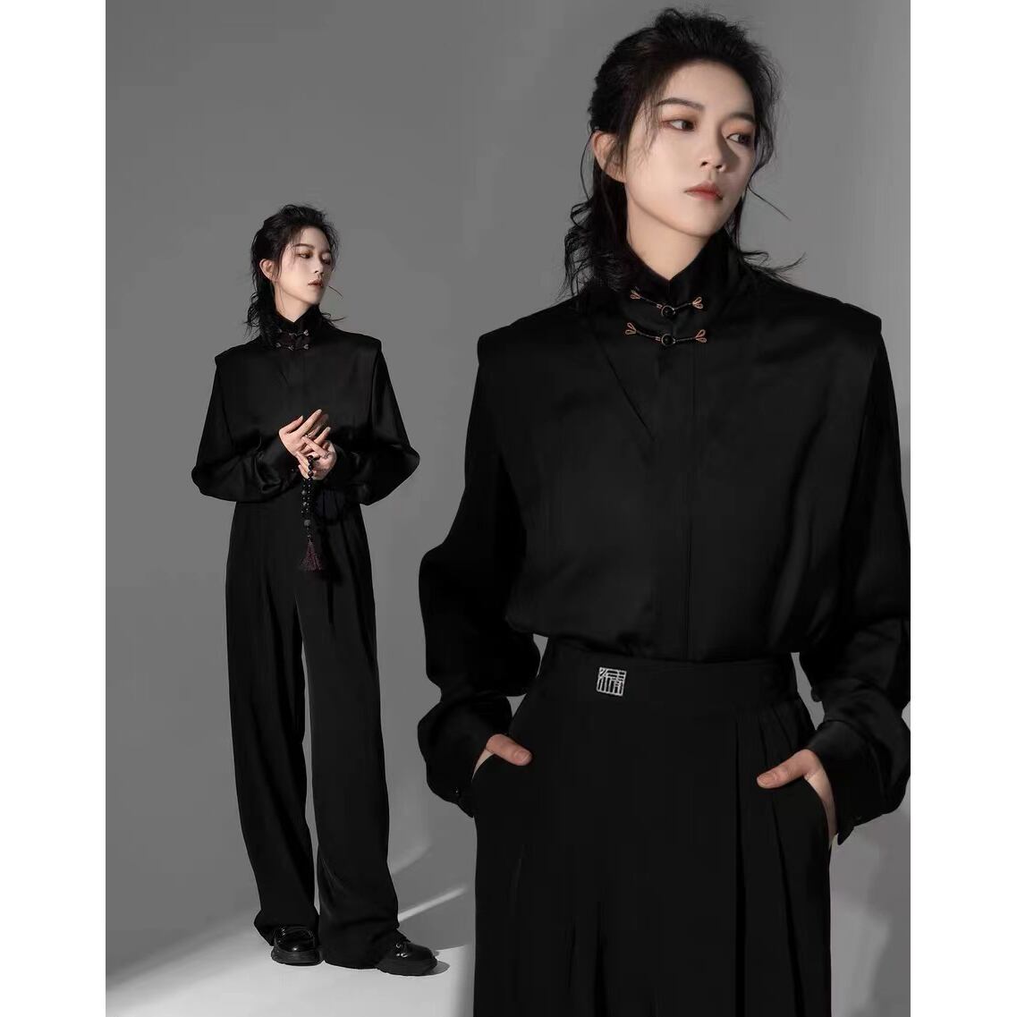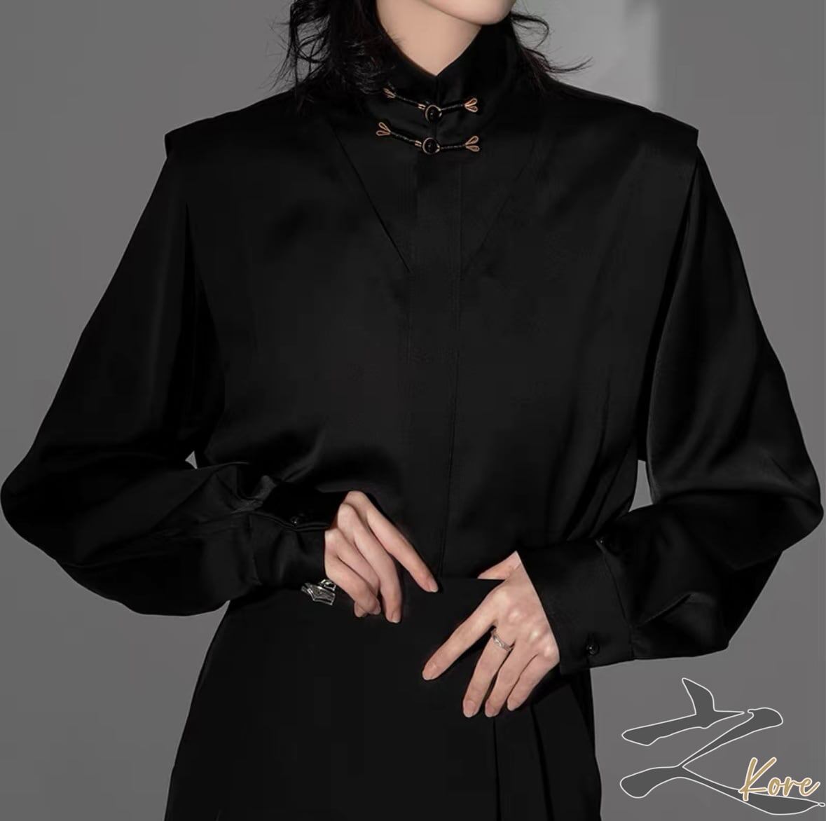 【之】★シャツ★ブラック シルバー チャイナ風 結び目ボタン エレガント 改良唐装
