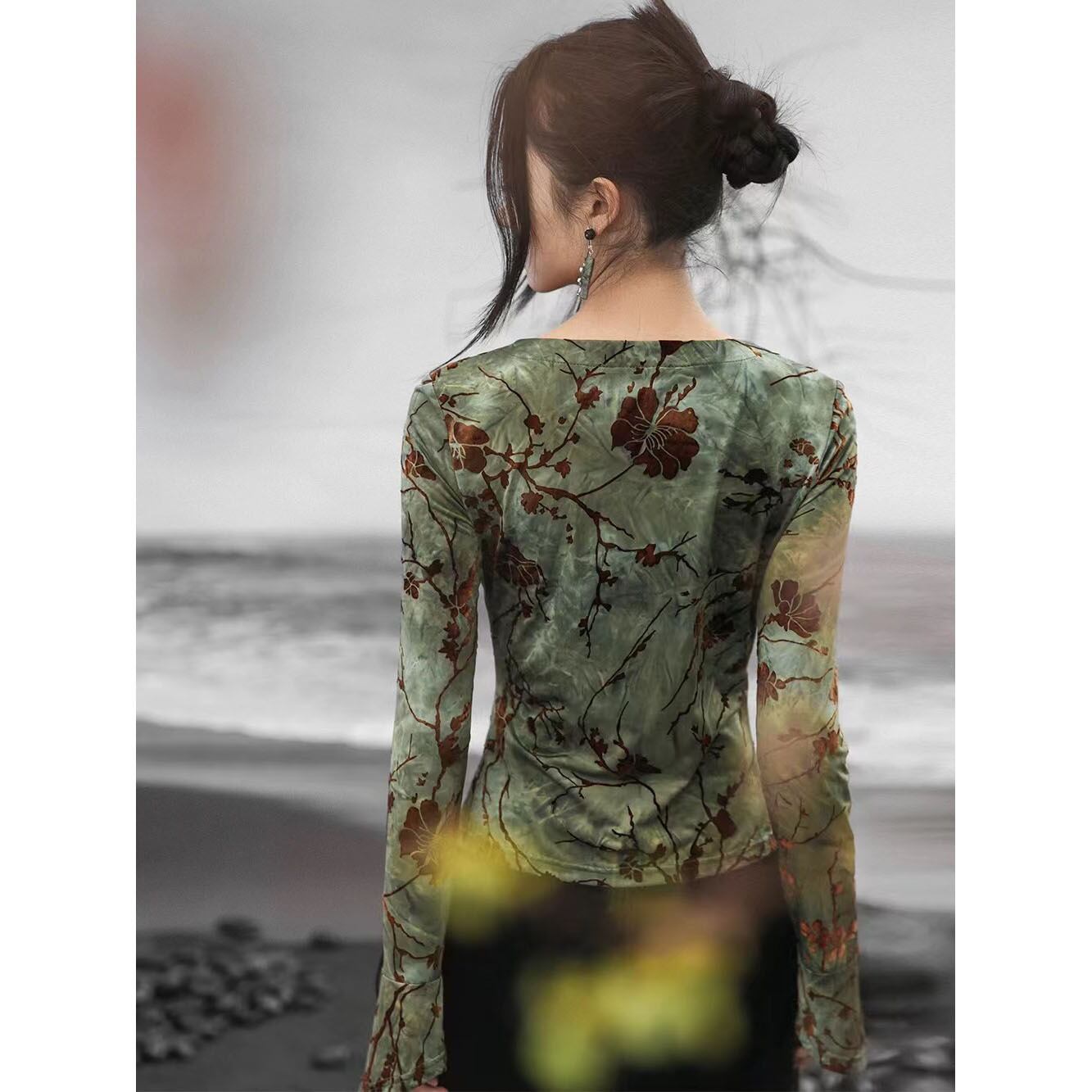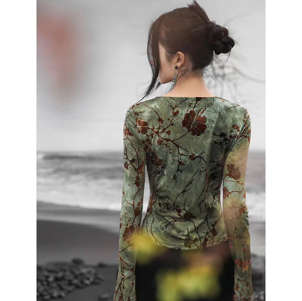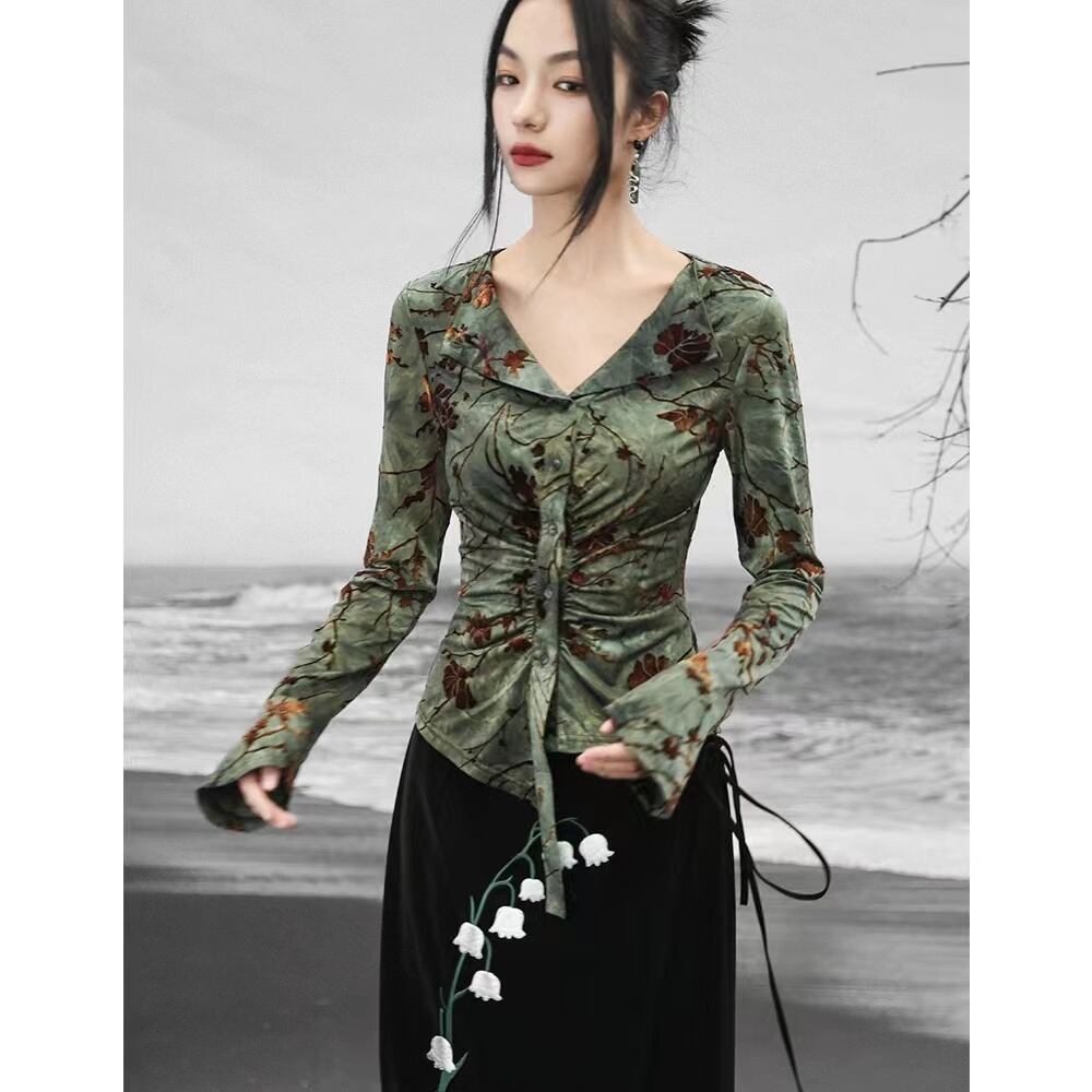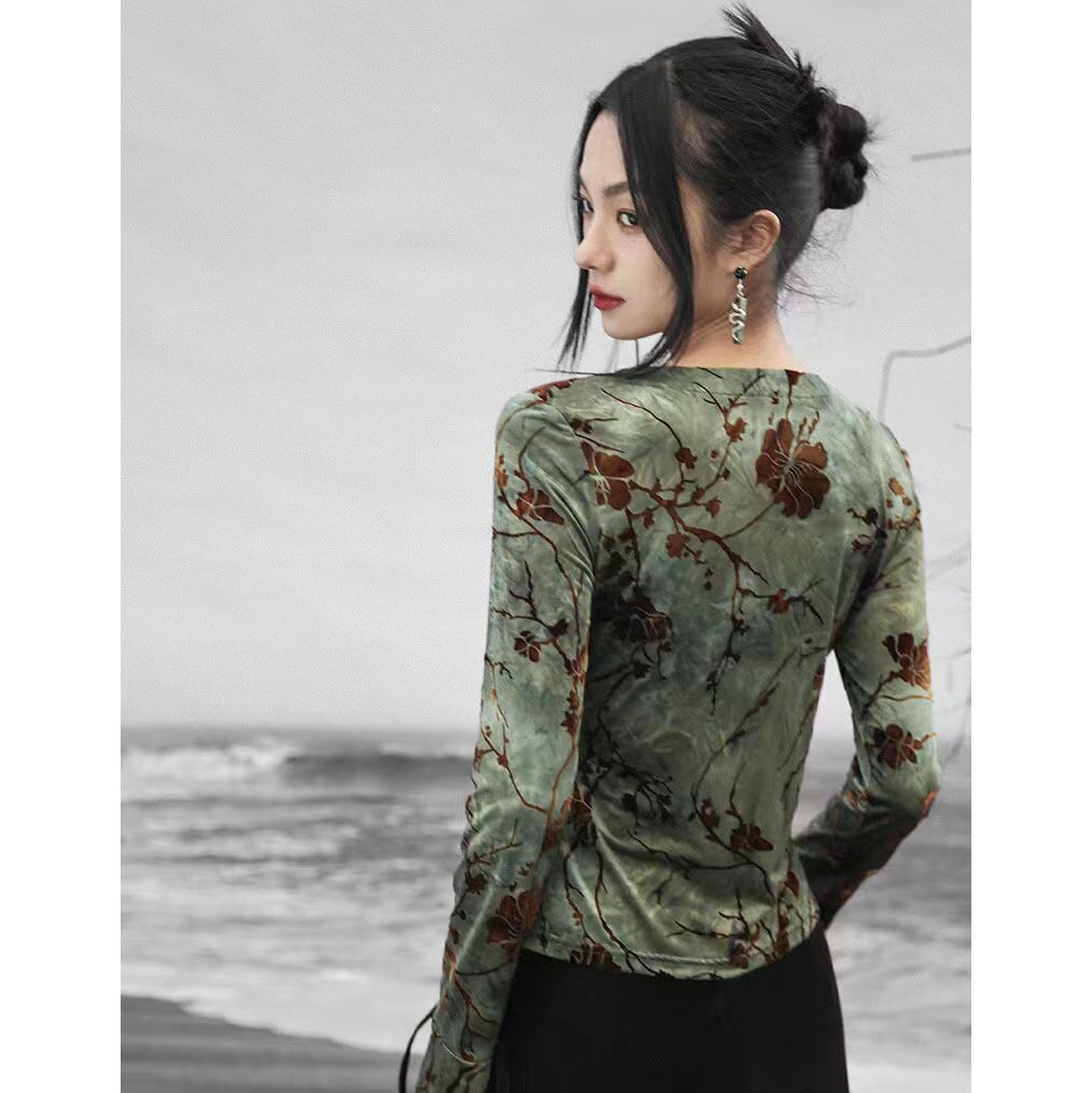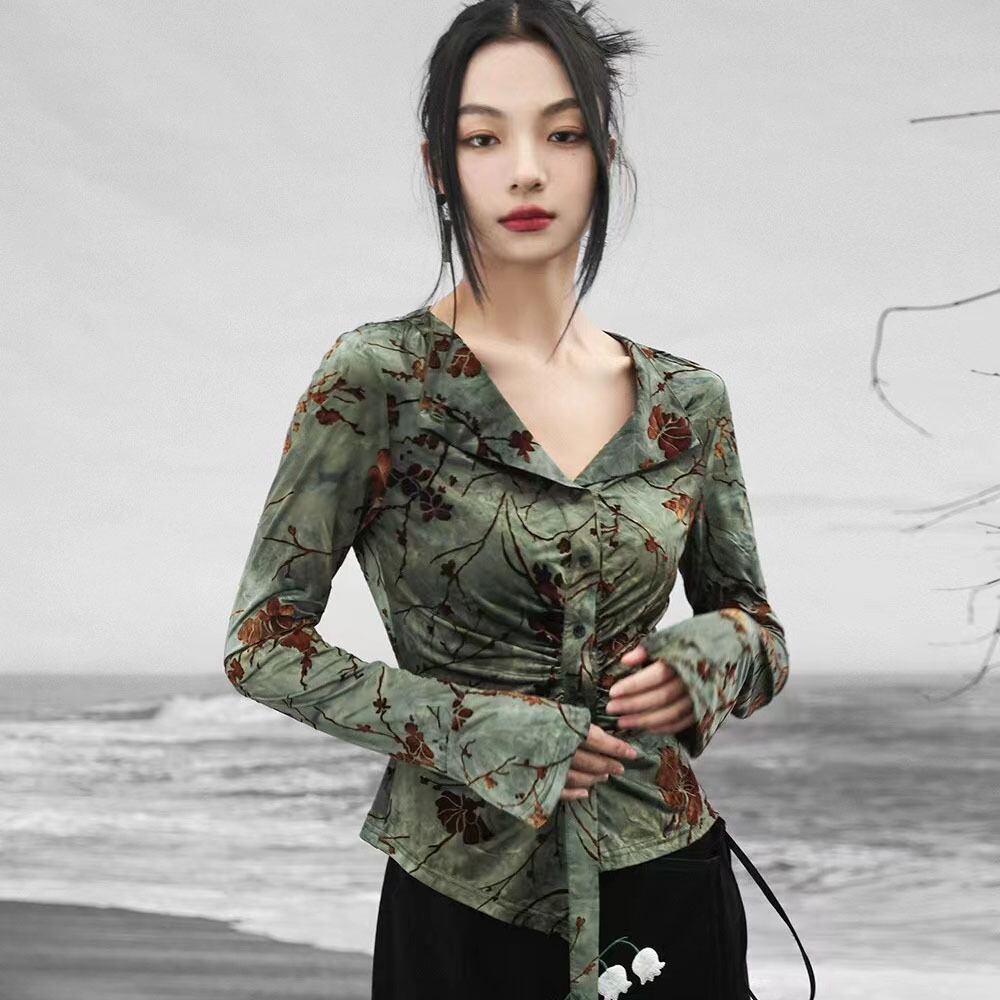 ◇半夏浮生◇【之x大青龍肆】★チャイナ風シャツ★グリーン 入学式 ファッション プリント 花柄