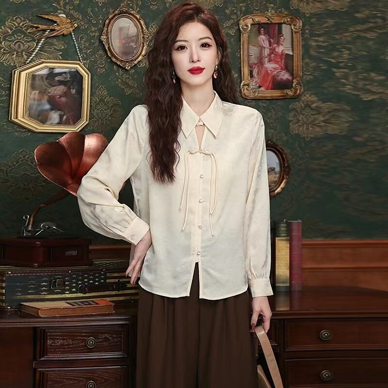 【之】★シャツ★ベージュ レッド 合わせやすい カジュアル 結び目ボタン
