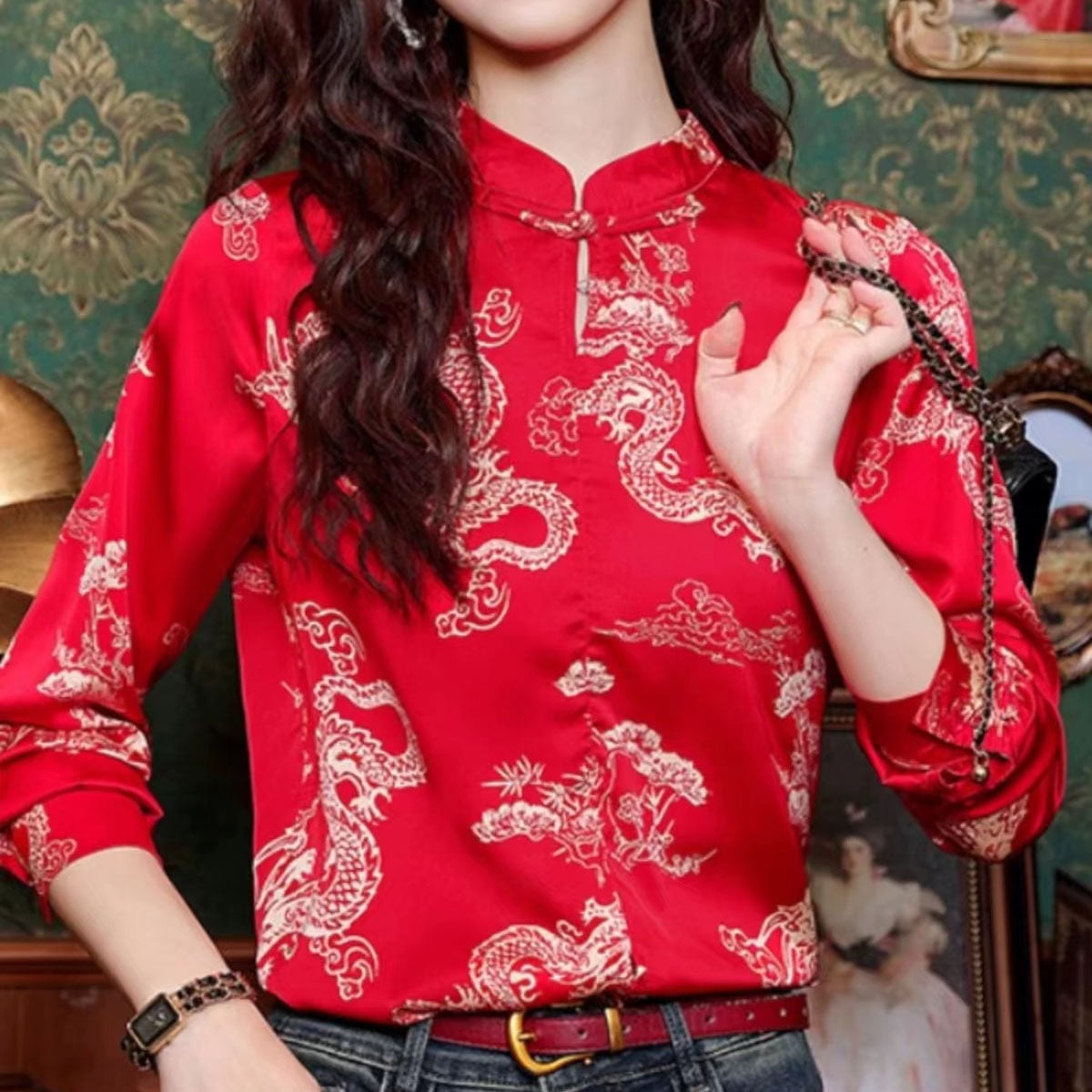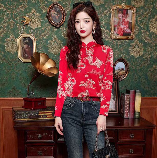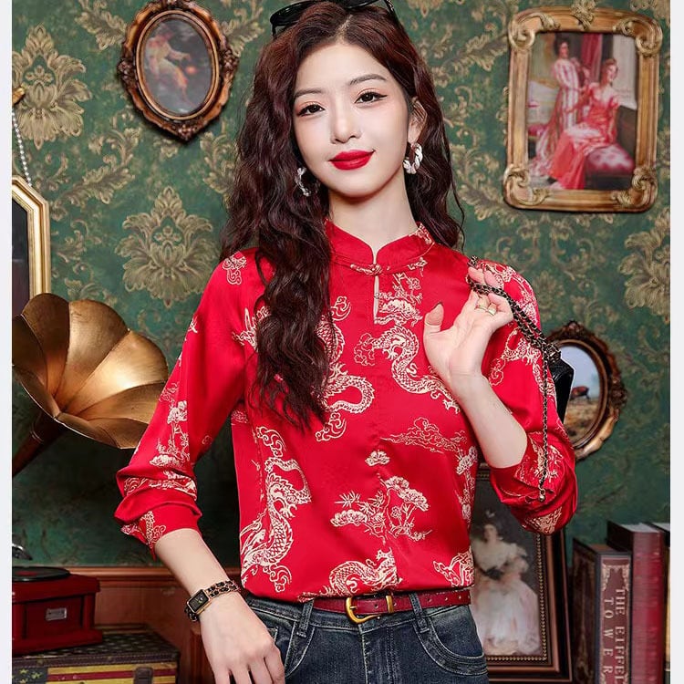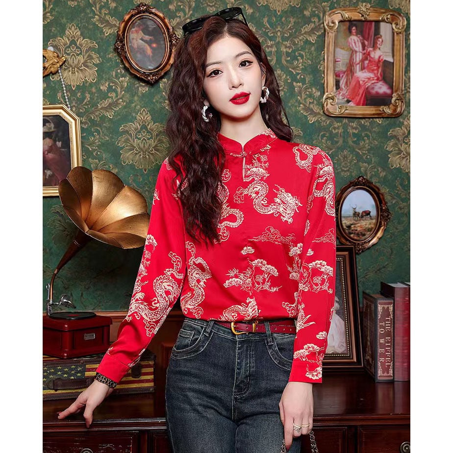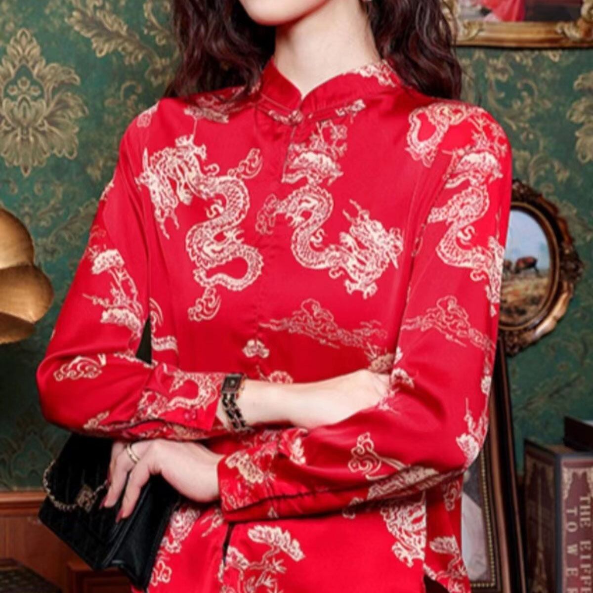 【之】★シャツ★レッド チャイナ風 カジュアル 合わせやすい 結び目ボタン 龍柄