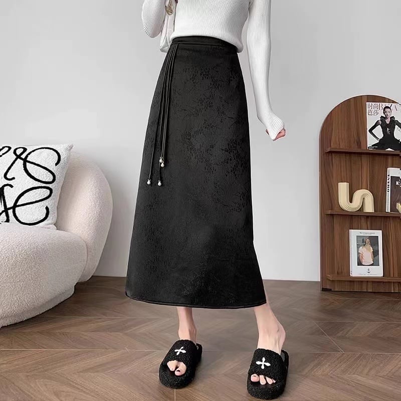 【之】★ロングスカート★ブラック チャイナ風 花柄 カジュアル プリント | 之