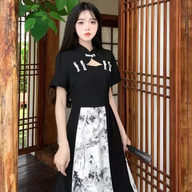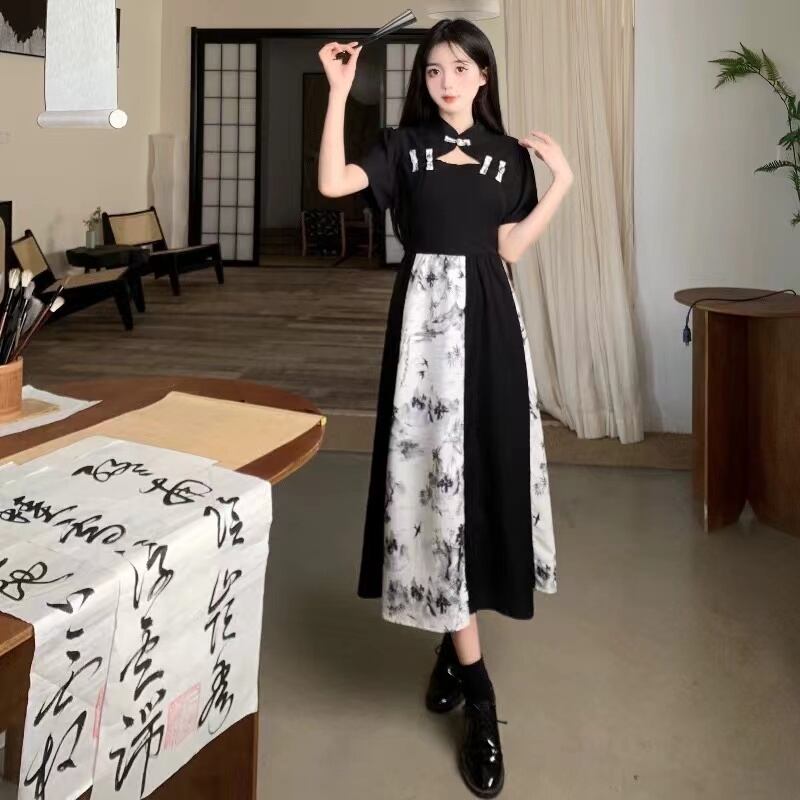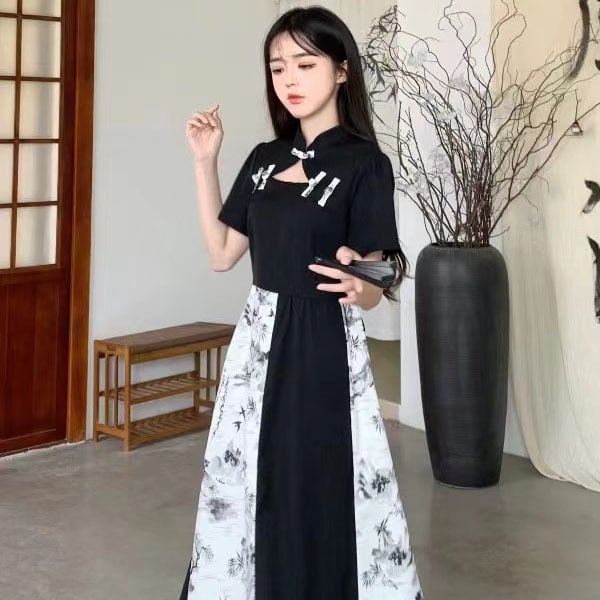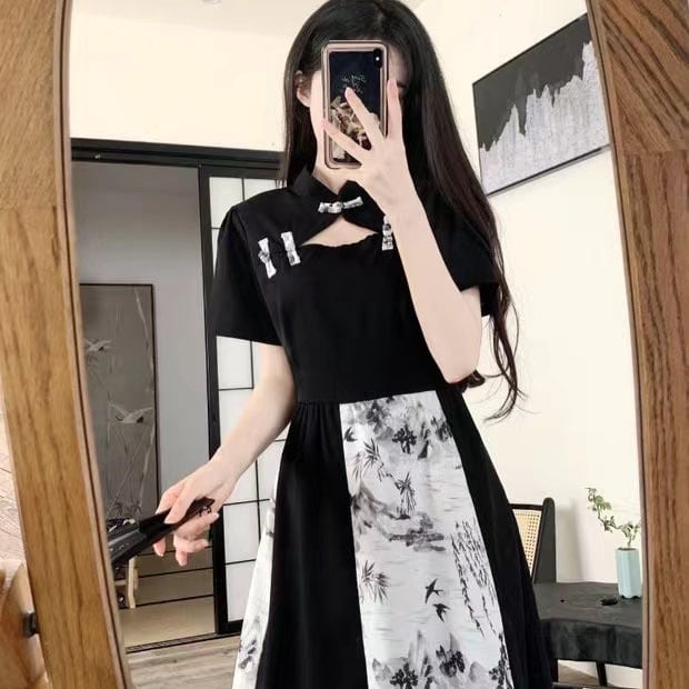 【之】★ワンピース★ブラック チャイナ風 カジュアル 結び目ボタン 花柄