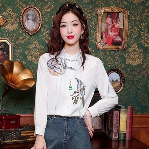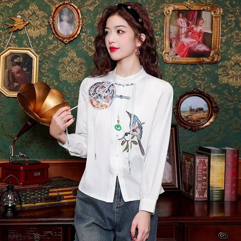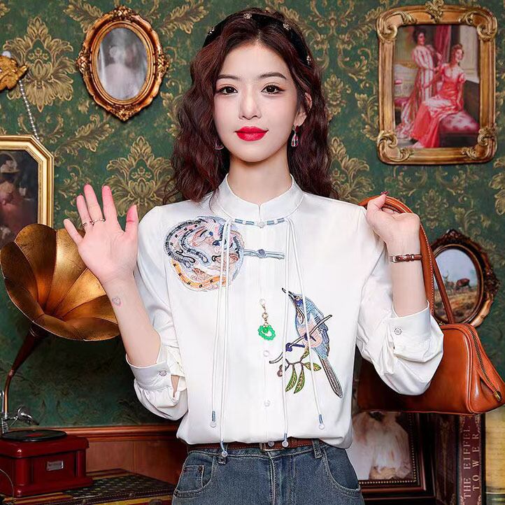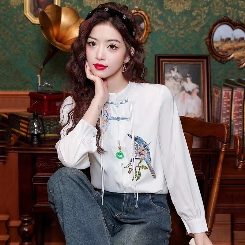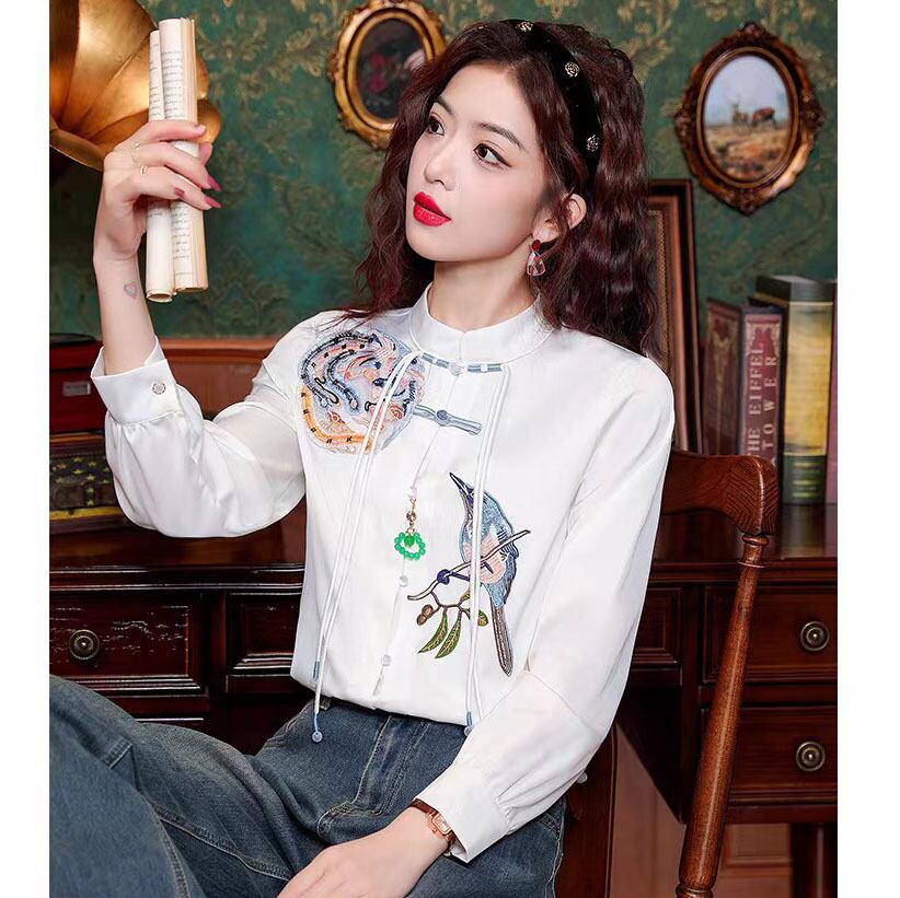【之】★シャツ★ホワイト チャイナ風 結び目ボタン 刺繍 鳥