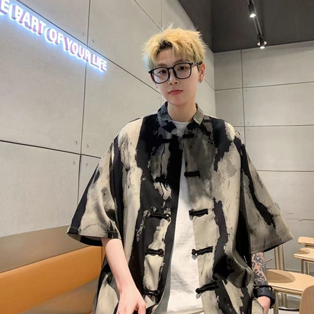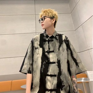 【之】★シャツ★ブラック カジュアル 竹 プリント 結び目ボタン | 之