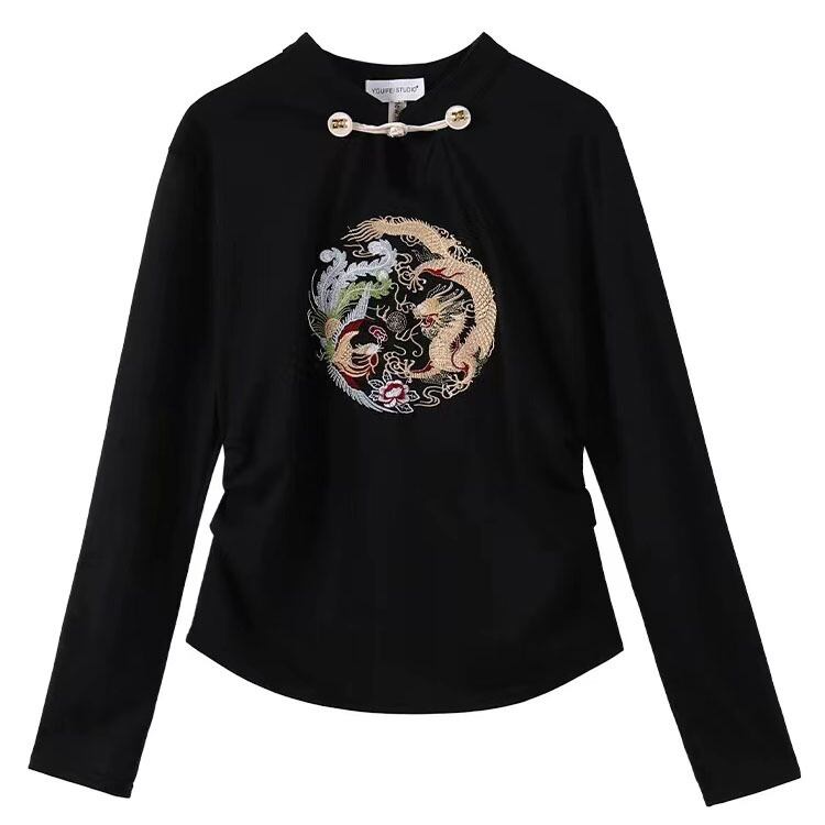 【之】★シャツ★ブラック チャイナ風 結び目ボタン 刺繍