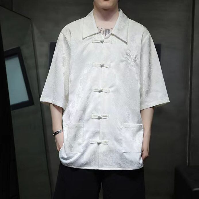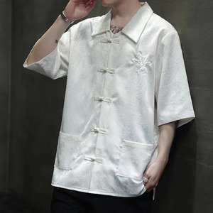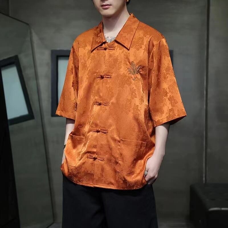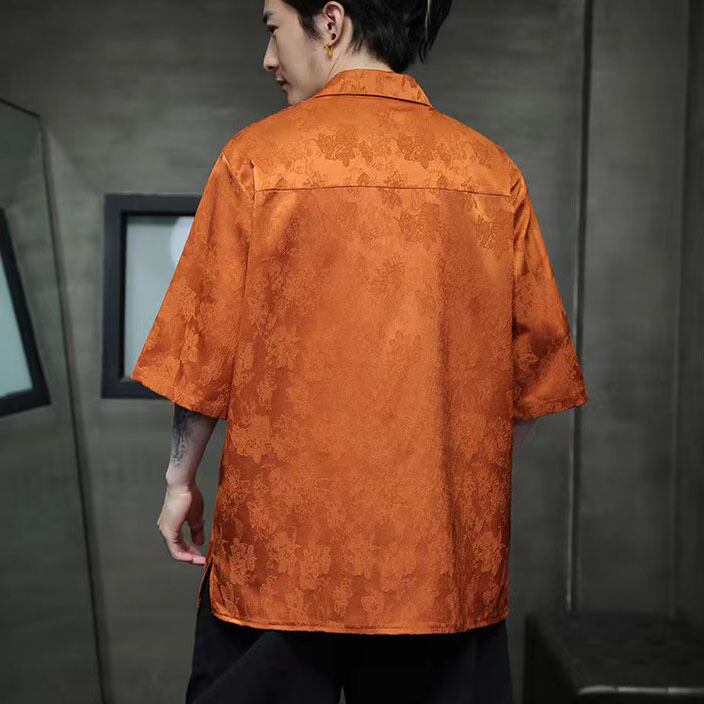 【之】★シャツ★オレンジ ホワイト カジュアル 結び目ボタン 綴り合せ | 之