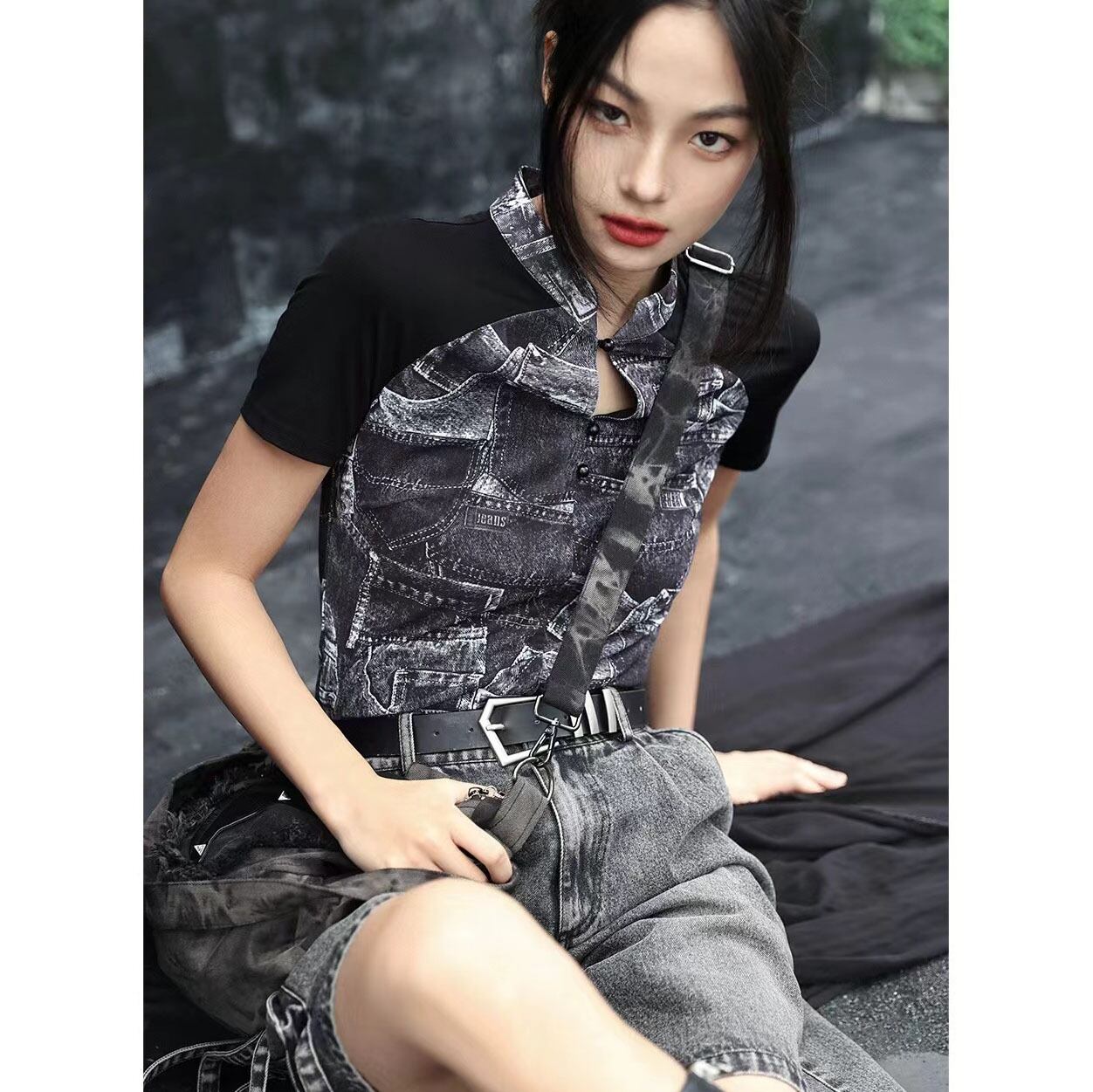 ◇盗花人落春江◇【之x大青龍肆】★Tシャツ★ブラック レディース服 綴り合せ プリント 結び目ボタン
