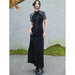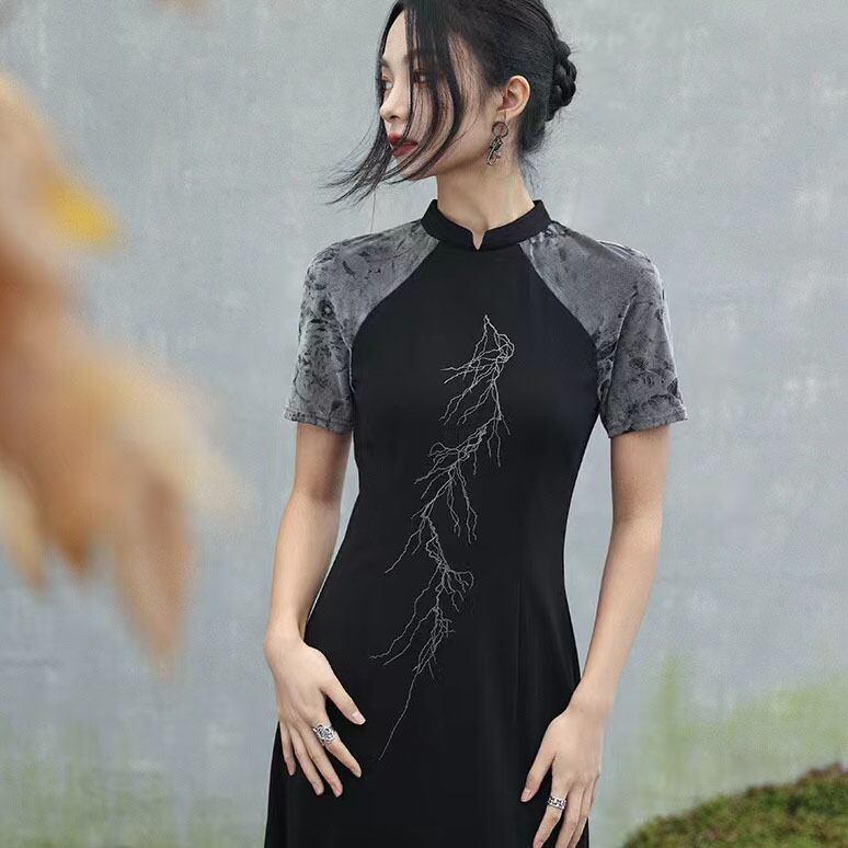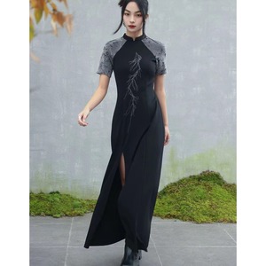 ◇盗花人落春江◇【之x大青龍肆】★ワンピース★ブラック レディース服 二次会 女子会 結び目ボタン 成人式 刺繍