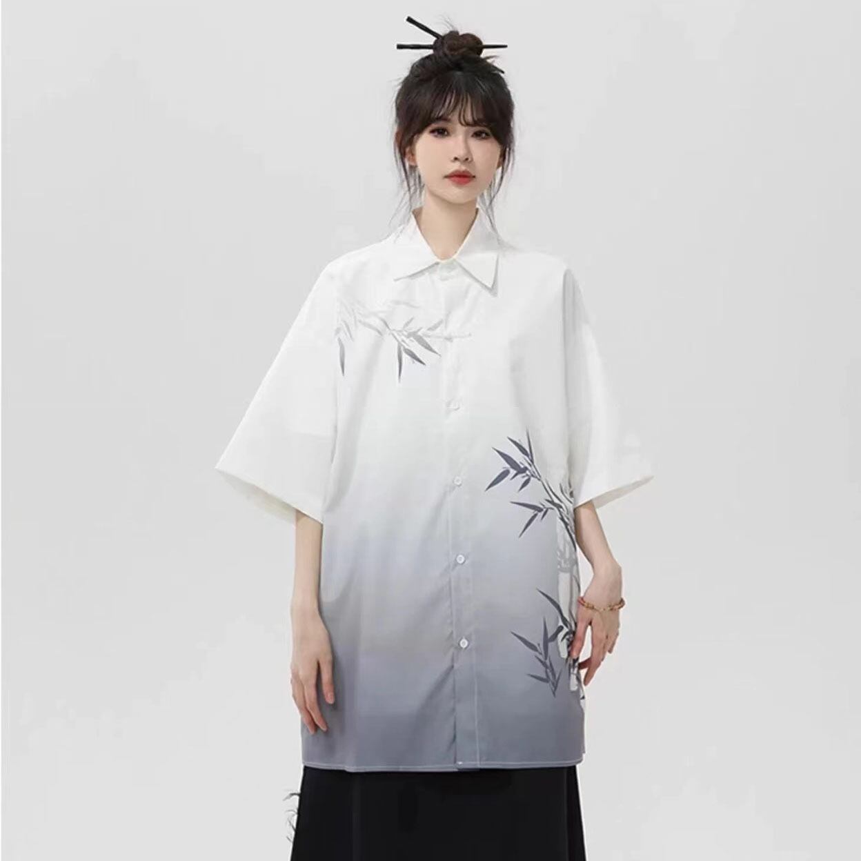 【之】★シャツ★グレー グリーン 合わせやすい カジュアル 結び目ボタン 竹