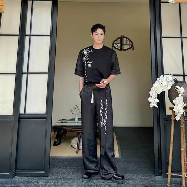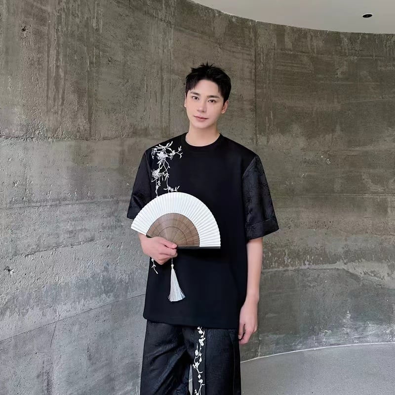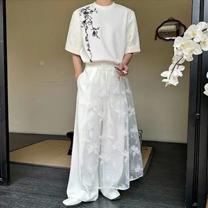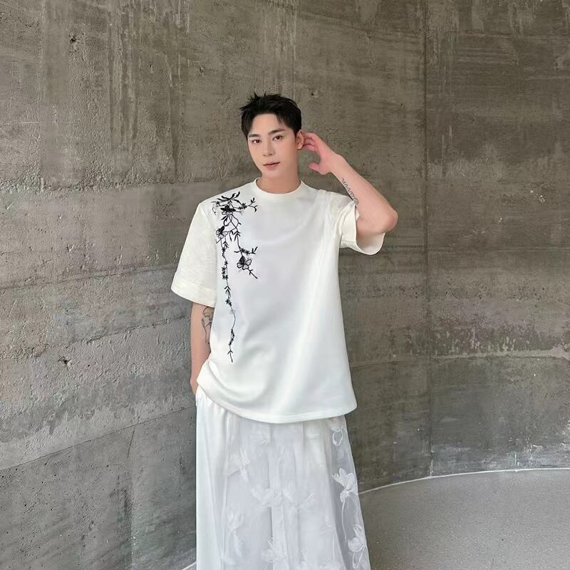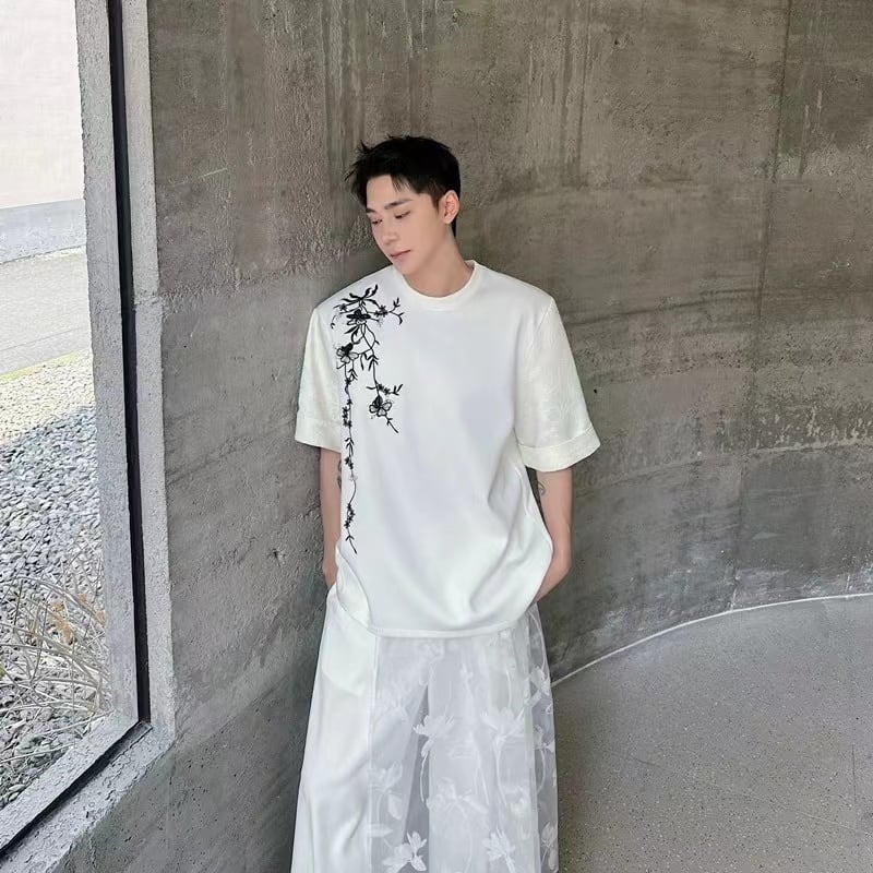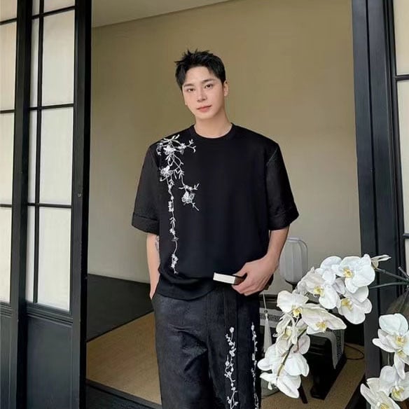 【之】★チャイナ風Tシャツ★ブラック ホワイト メンズ 刺繍 花柄