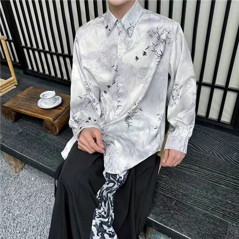 【之】★チャイナ風シャツ★ホワイト メンズ 竹 プリント