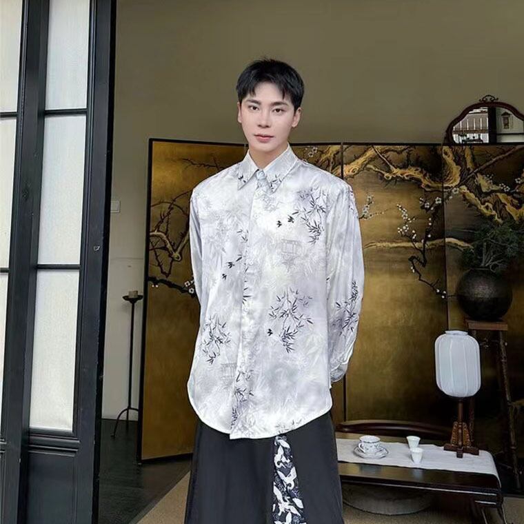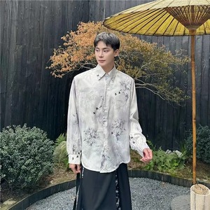 【之】★チャイナ風シャツ★ホワイト メンズ 竹 プリント | 之