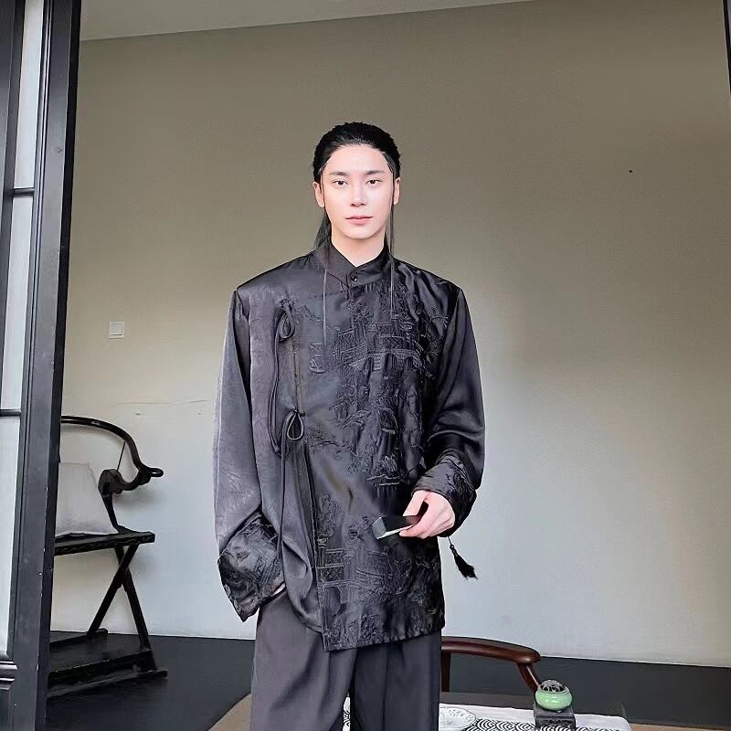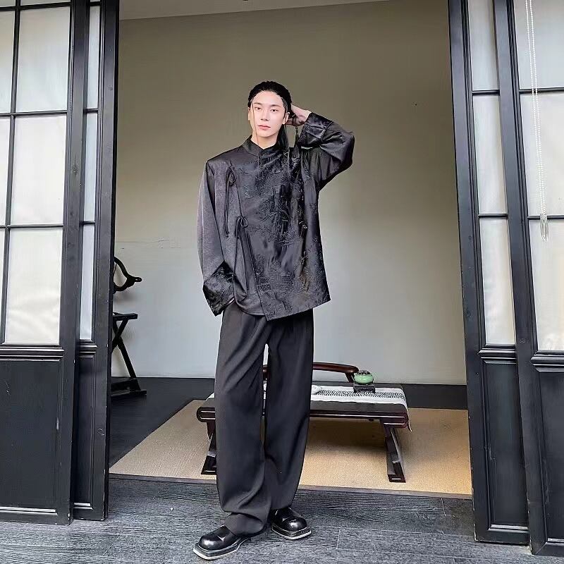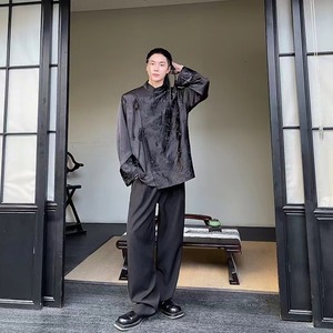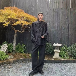 【之】★チャイナ風シャツ★ブラック メンズ 結び目ボタン アシンメトリー