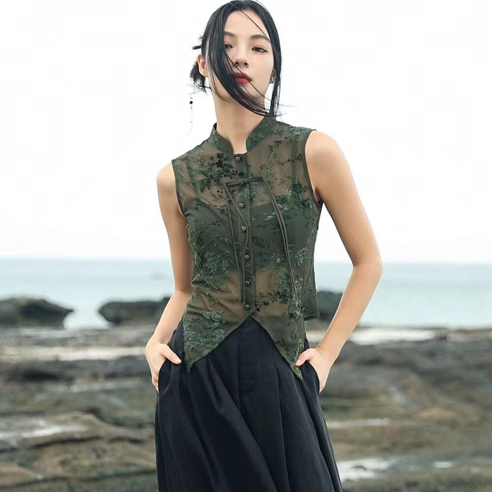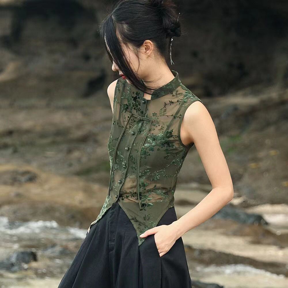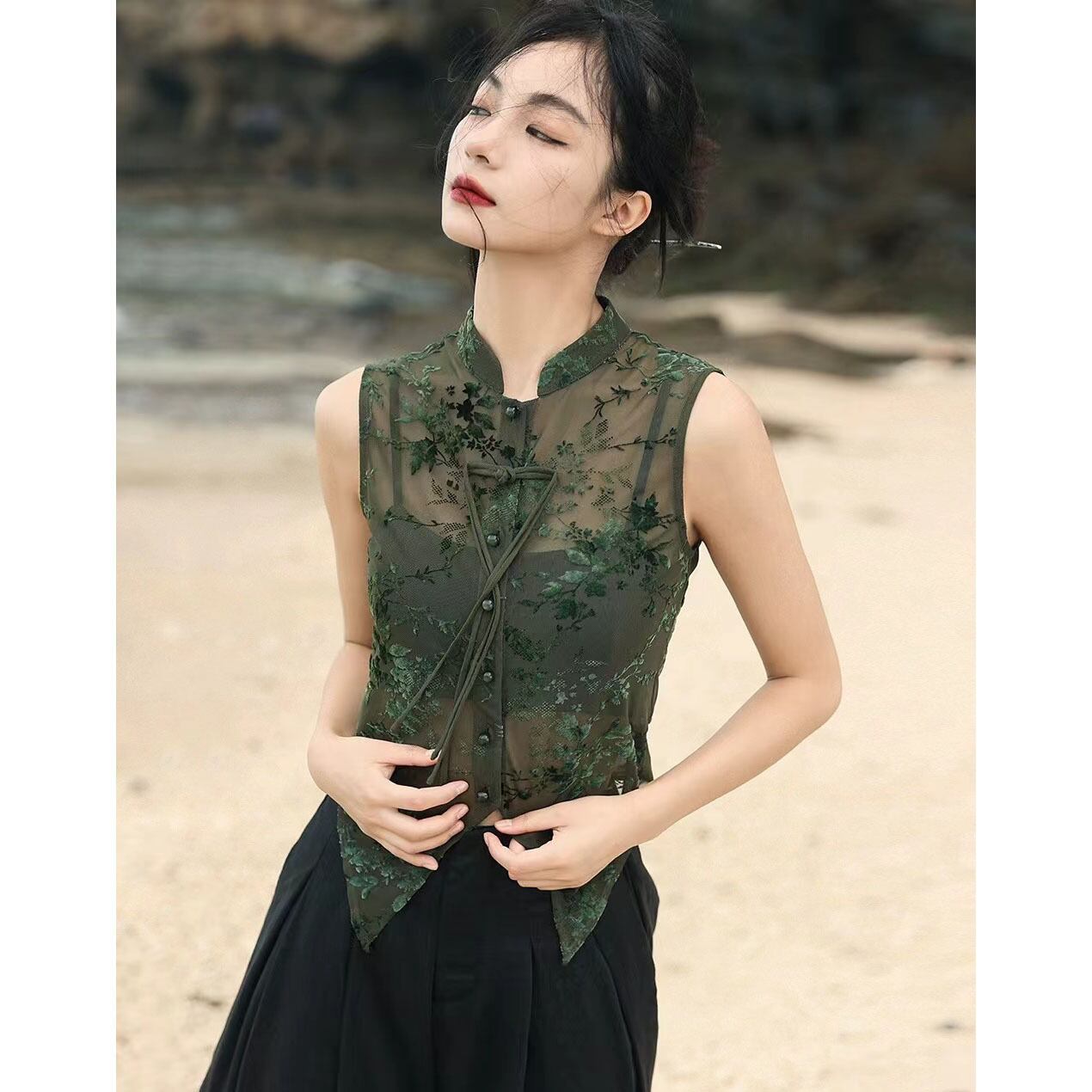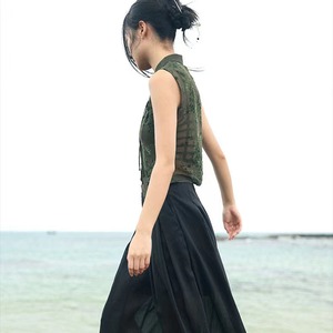 ◇蝶噛み砕宇宙◇【之x大青龍肆】★Tシャツ★グリーン レディース服 綴り合せ 結び目ボタン アシンメトリー