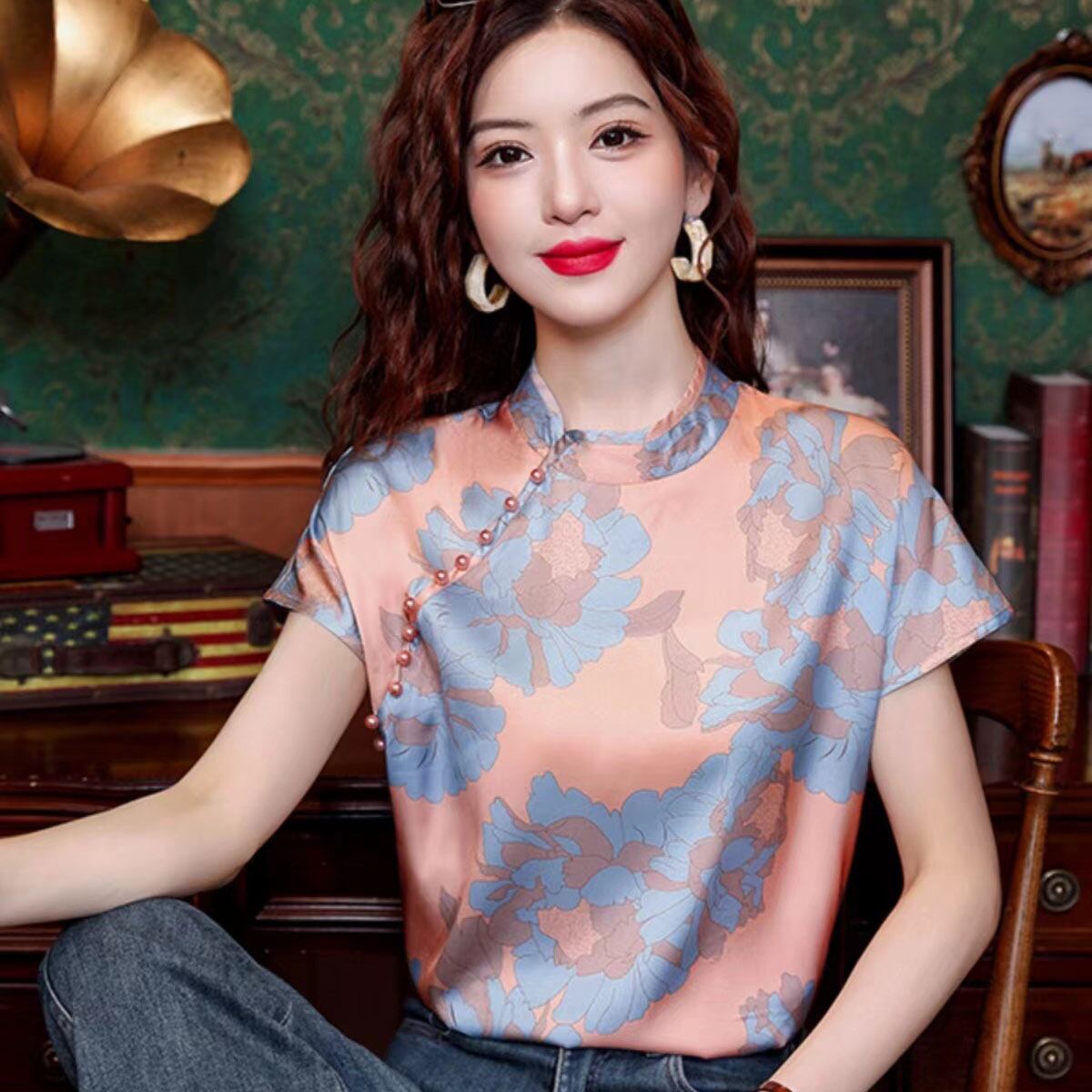 【之】★シャツ★チャイナ風 結び目ボタン プリント