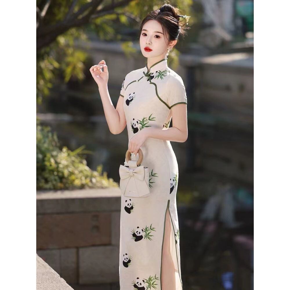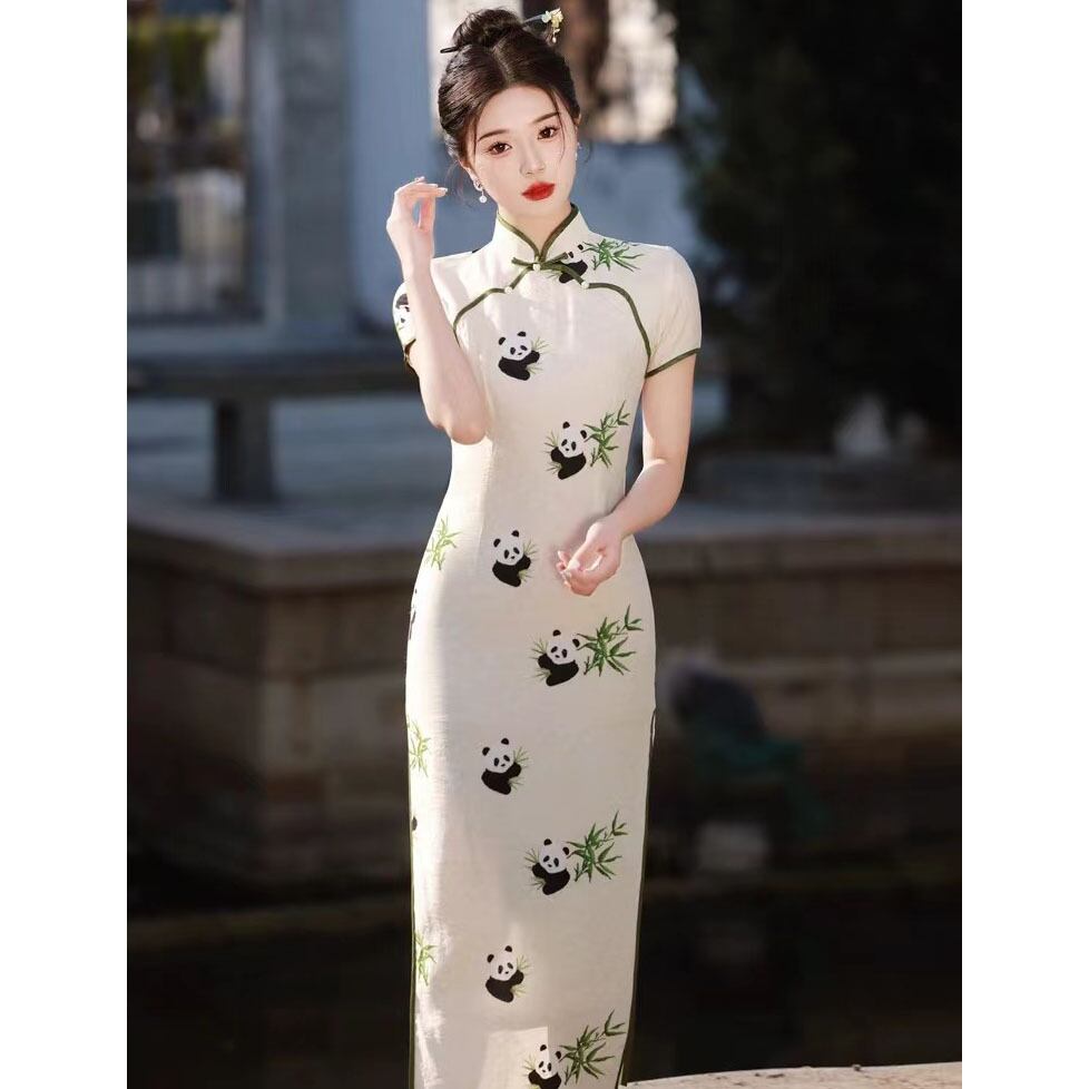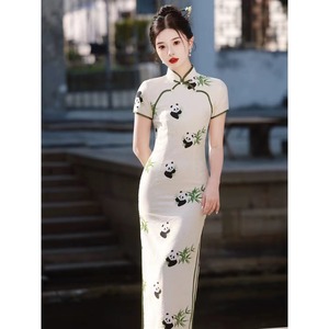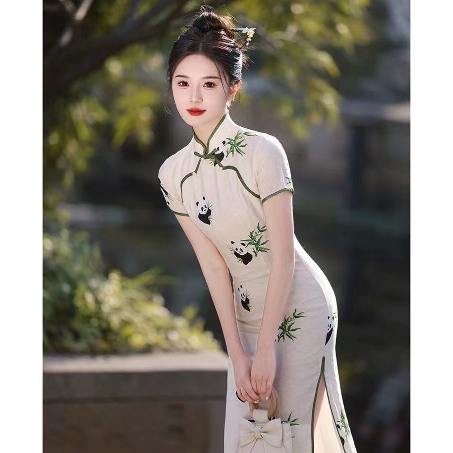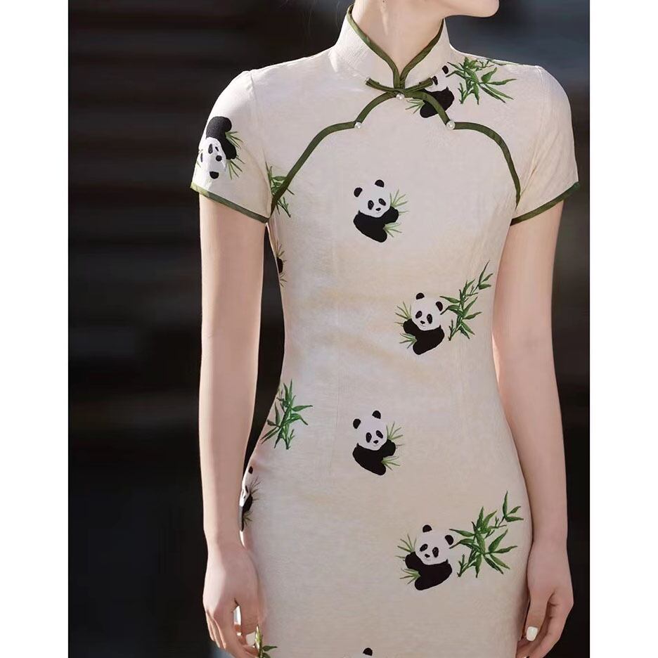 【之】★ワンピース★ホワイト チャイナ風 カジュアル 結び目ボタン パンダ