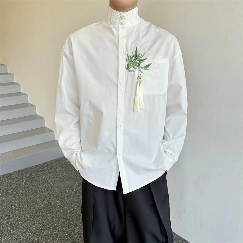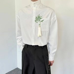 【之】★チャイナ風シャツ★ホワイト メンズ 刺繍 竹 タッセル