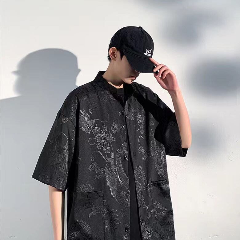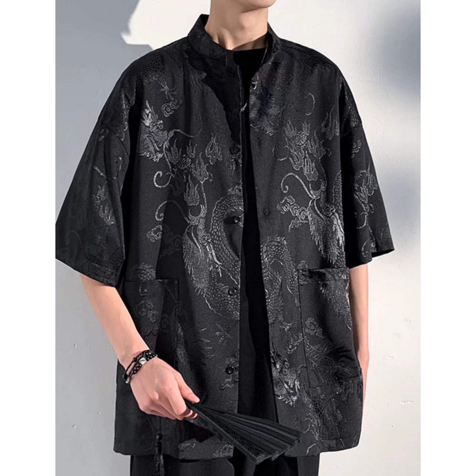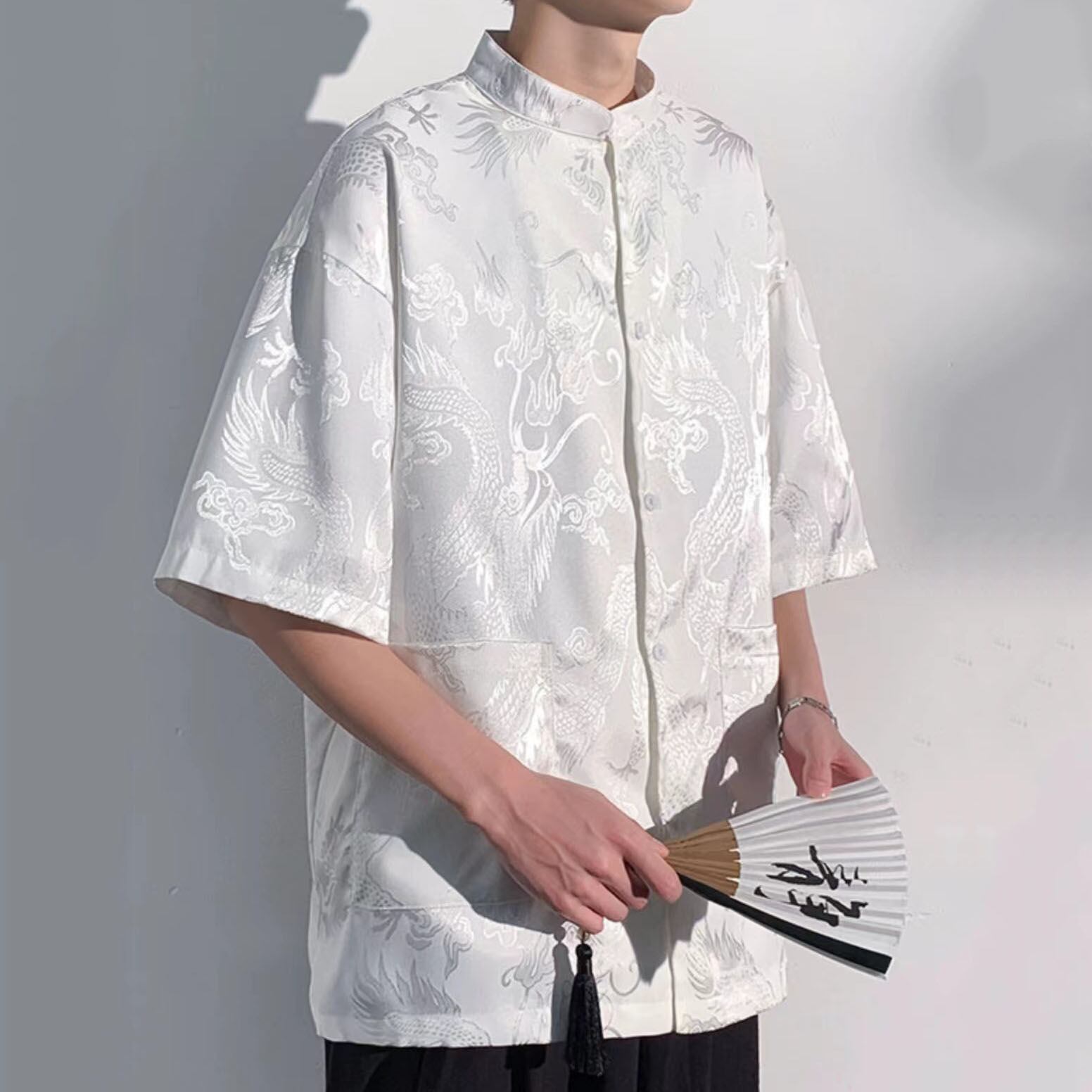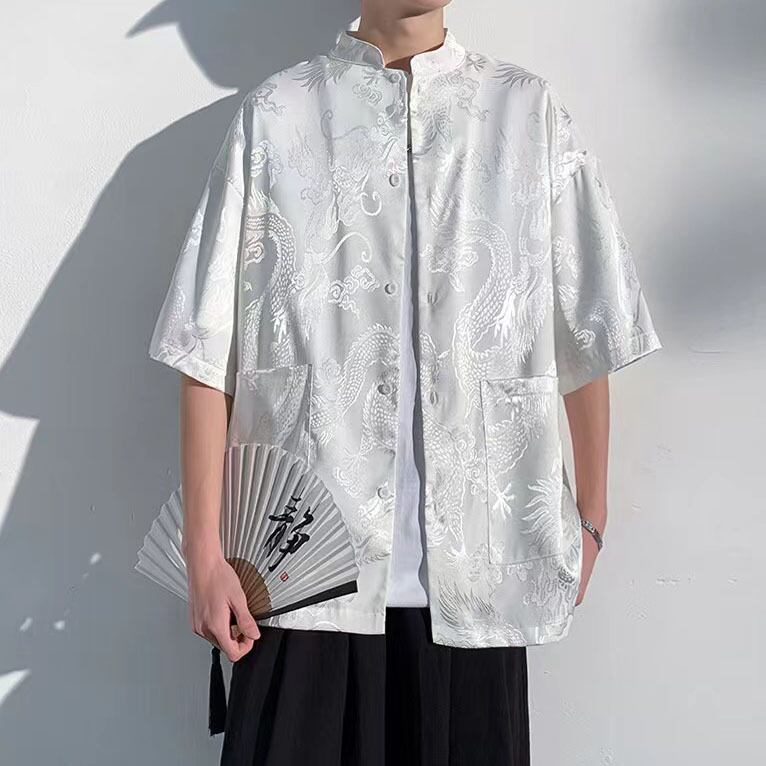 【之】★チャイナ風シャツ★ホワイト ブラック メンズ 結び目ボタン 龍柄