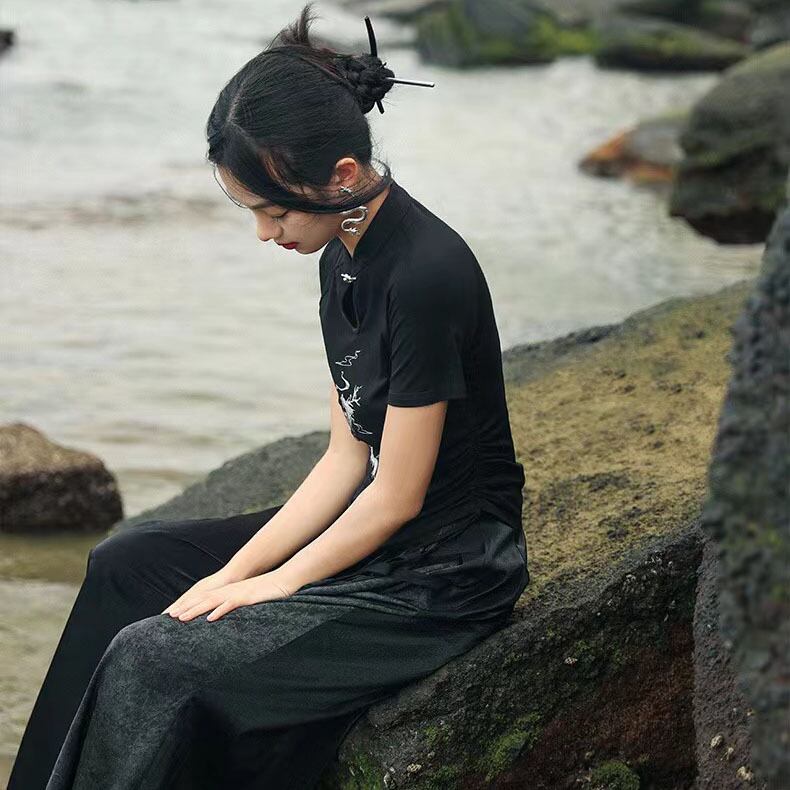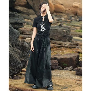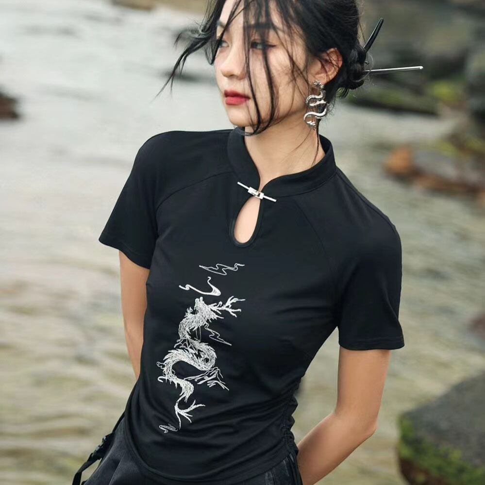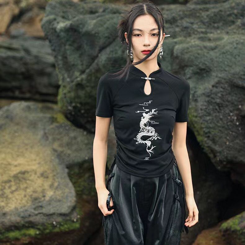 ◇万里寂星◇【之x大青龍肆】★Tシャツ★ブラック レディース服 綴り合せ 結び目ボタン 龍柄