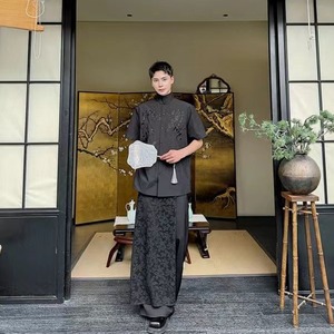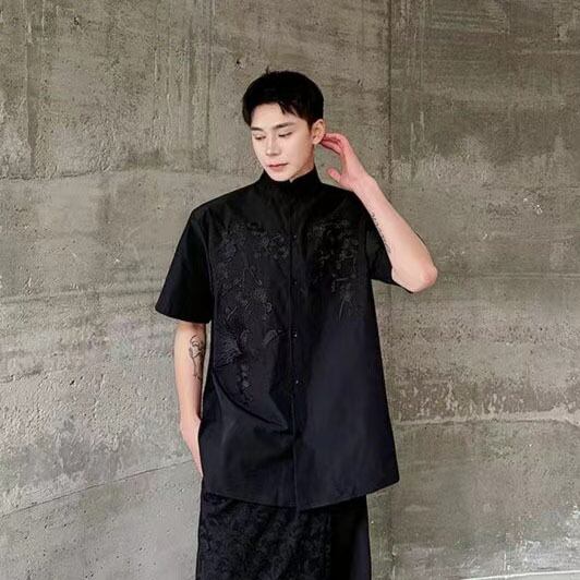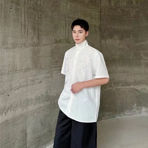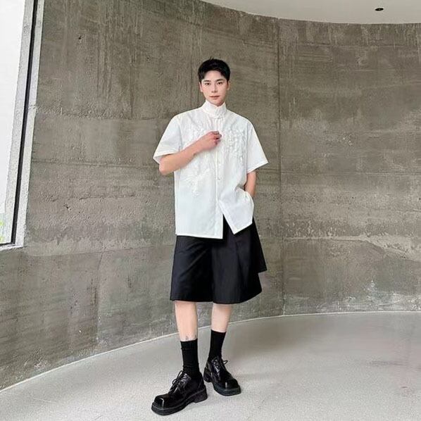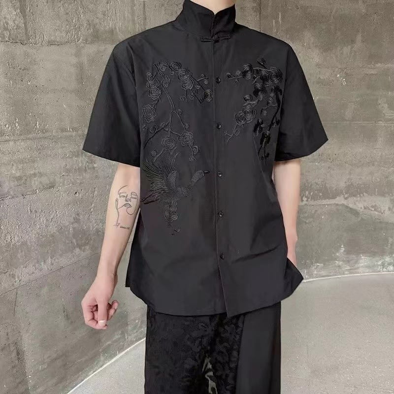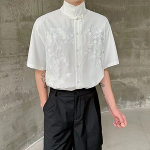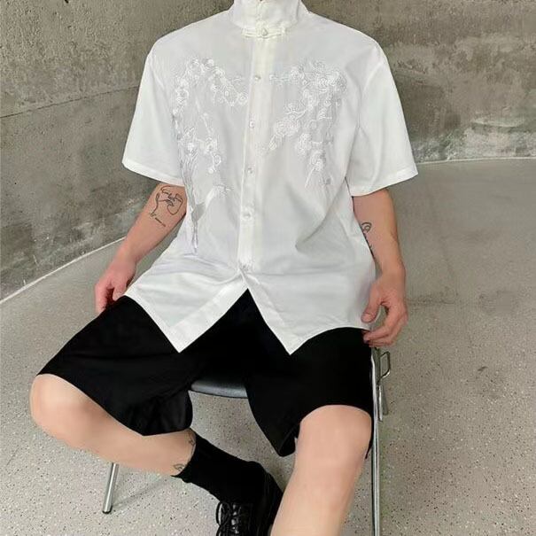 【之】★チャイナ風シャツ★ホワイト ブラック メンズ 刺繍 鶴柄