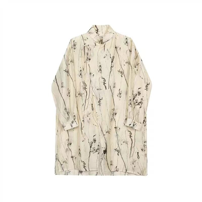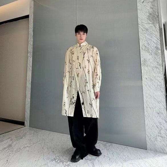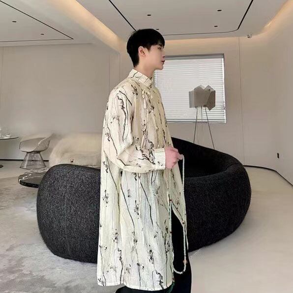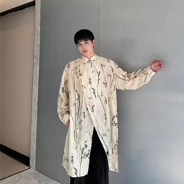 【之】★チャイナ風シャツ★イェロー メンズ 結び目ボタン プリント 宮廷貴族風