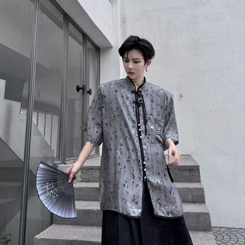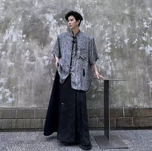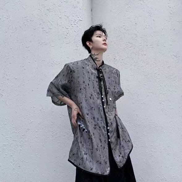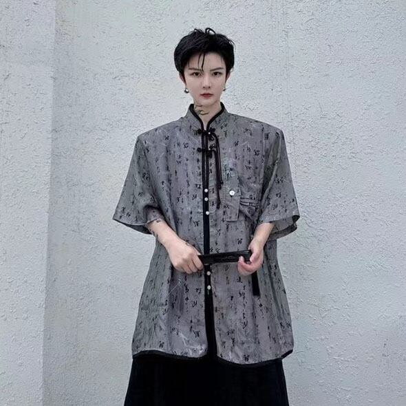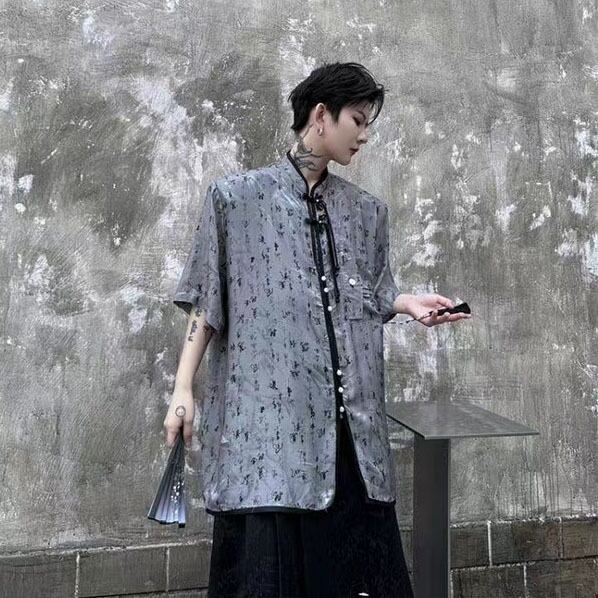 【之】★シャツ★グレー カジュアル ファッション 漢字 結び目ボタン