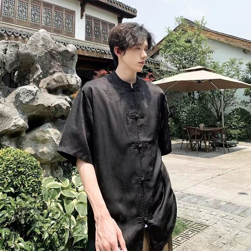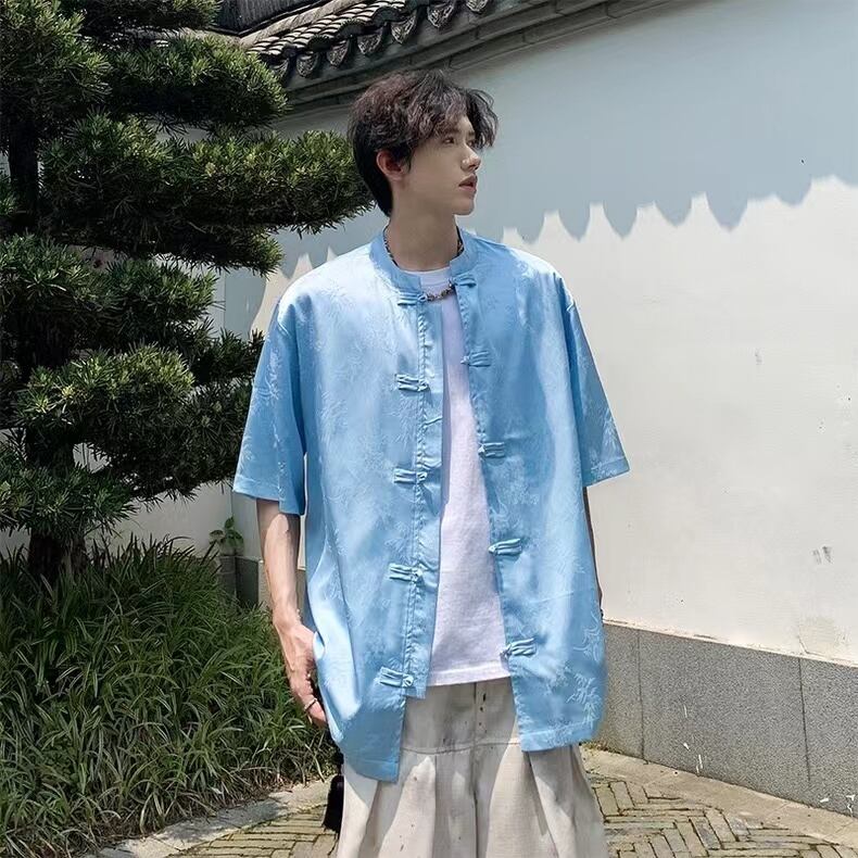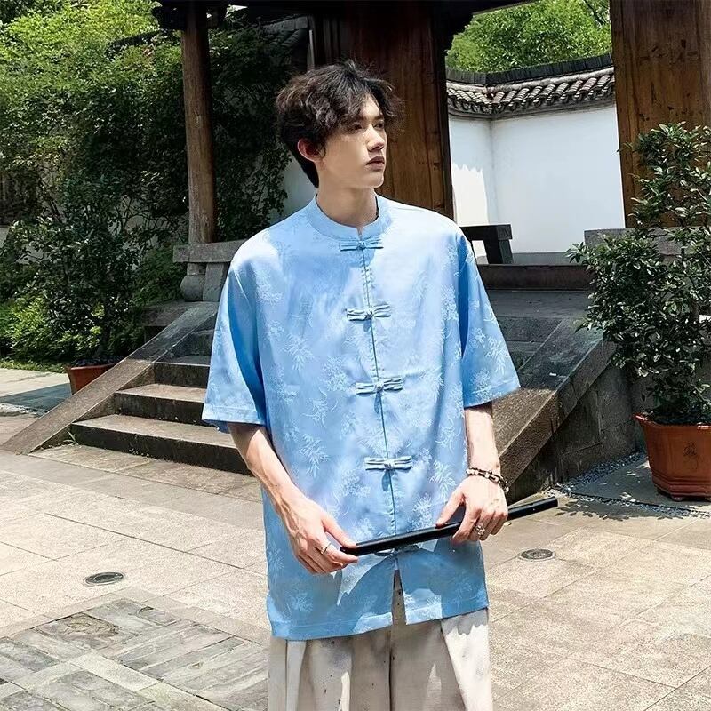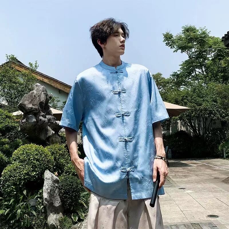 【之】★シャツ★ブラック イェロー ブルー カジュアル ファッション 結び目ボタン 竹
